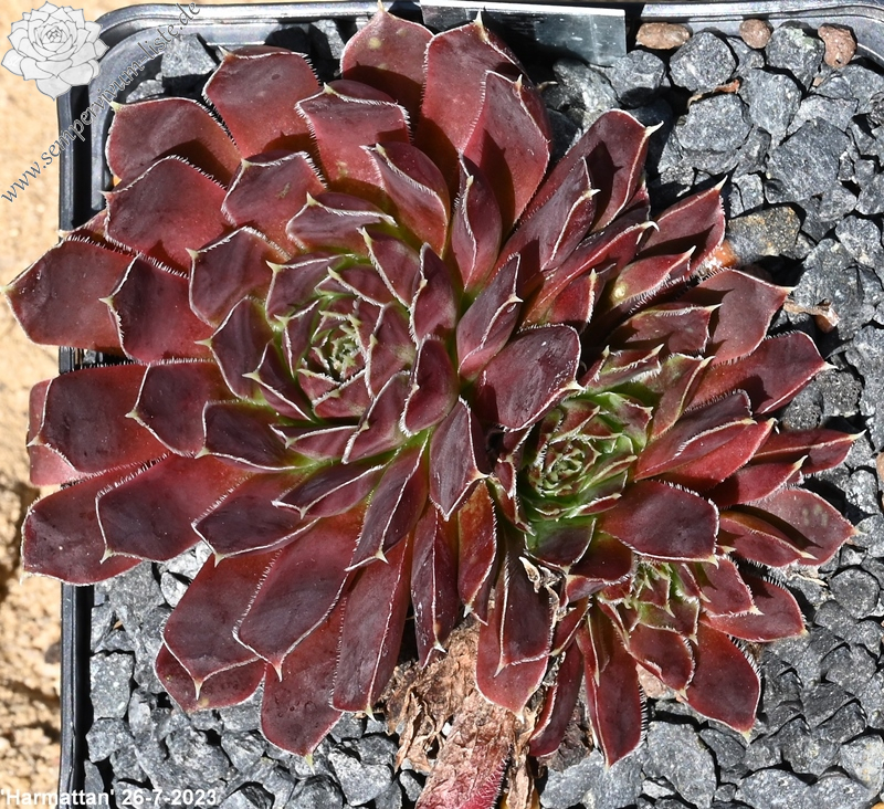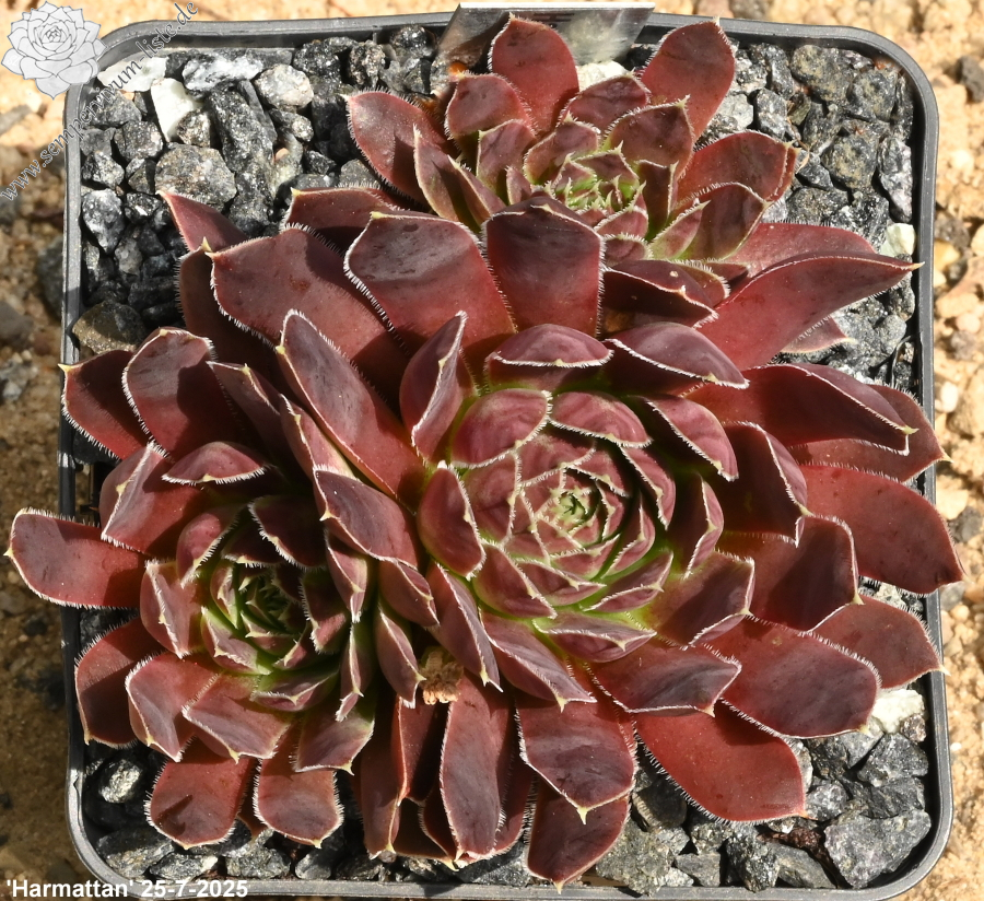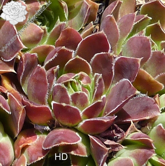 Große Rosetten in rotbraunen Tönen mit leuchtendem hell- bis olivgrünem Zentrum. Durch die weiße Bewimperung der Blätter zeigen sie einen silbrigen Rand.
