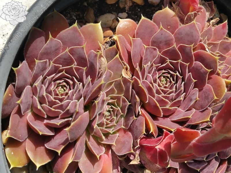 große Rosetten, ovale Blätter, lang bespitzt, dunkles Weinrot mit Ocker, Blattränder hell, kleine Wimpern
