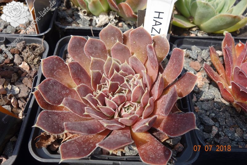 kleine Rosetten, Blätter spatelig, lang bespitzt, bordeauxviolett, Blattränder hell