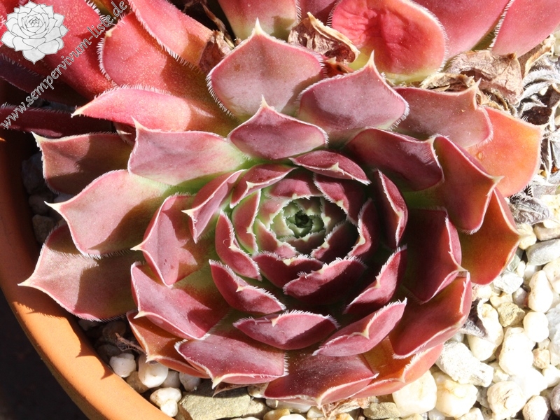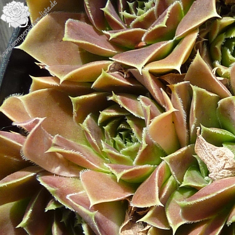 Rosetten 5 cm, Blätter eiförmig, lang bespitzt, Basis helles Grün, Rest hellbraun - beige zu rot übergehend, Blattränder hell bewimpert