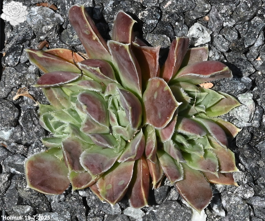 'Holmul' bildete mittelgroße Rosetten ca.6cm, deren Blätter oval förmig und lang bespitzt sind. Die dichte, kurze Bewimperung sorgt für einen auffälligen hellen Blattrand. Die Farben wechseln von Rot lila bis blau lila. Die Basis der Rosetten ist lindgrün. 'Holmul' stammt aus derselben Aussaat wie der Geschwistersämling 'Tikal', doch leider haben weder er noch 'Tikal' das samtige Aussehen der Mutter geerbt. Die Blätter sind zu jeder Jahreszeit glatt.