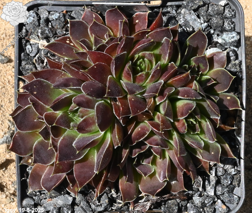 Rosetten bis 6 cm, Blätter lanzettlich, lang bespitzt, samtige Substanz, rotviolett - signalviolett, Ränder bewimpert