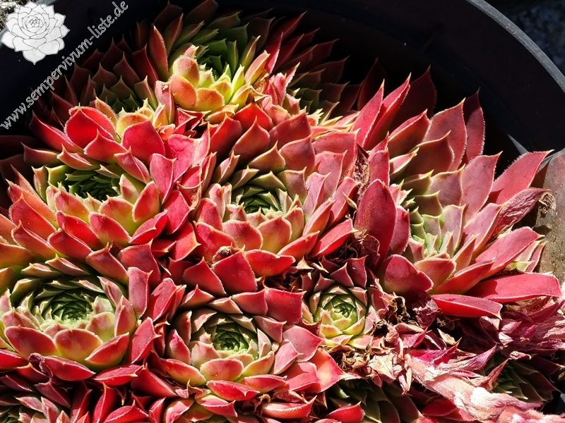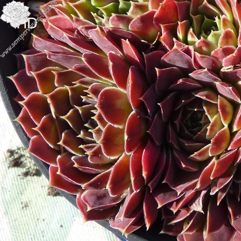 Rosetten bis 6 cm, Blätter oval, lang bespitzt, dunkles Rot, Blattränder hell