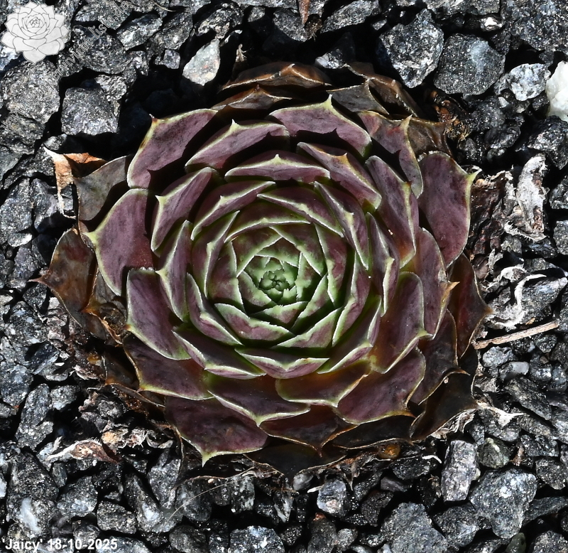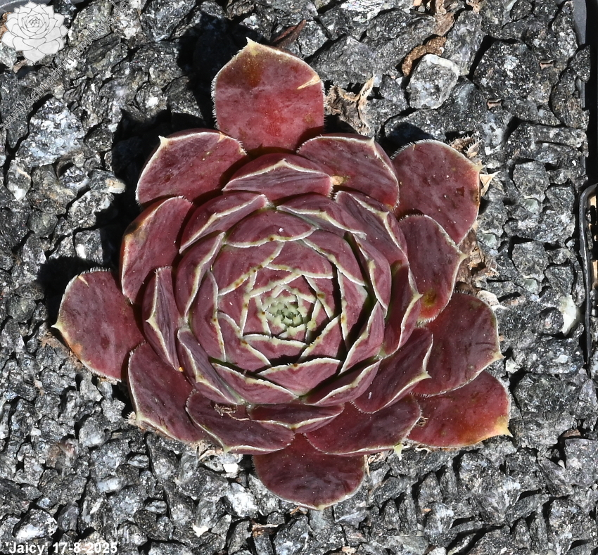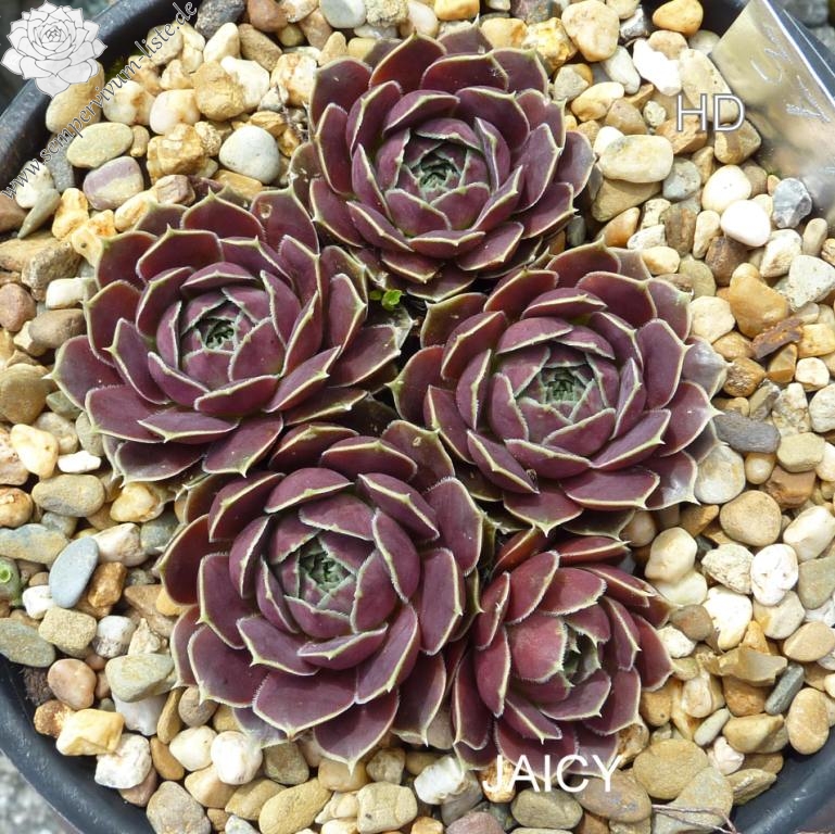 Rosetten bis 6 cm, Blätter rundlich, kurz bespitzt, rotlila - altrosa, Herz hellgrün, Blattränder hell
