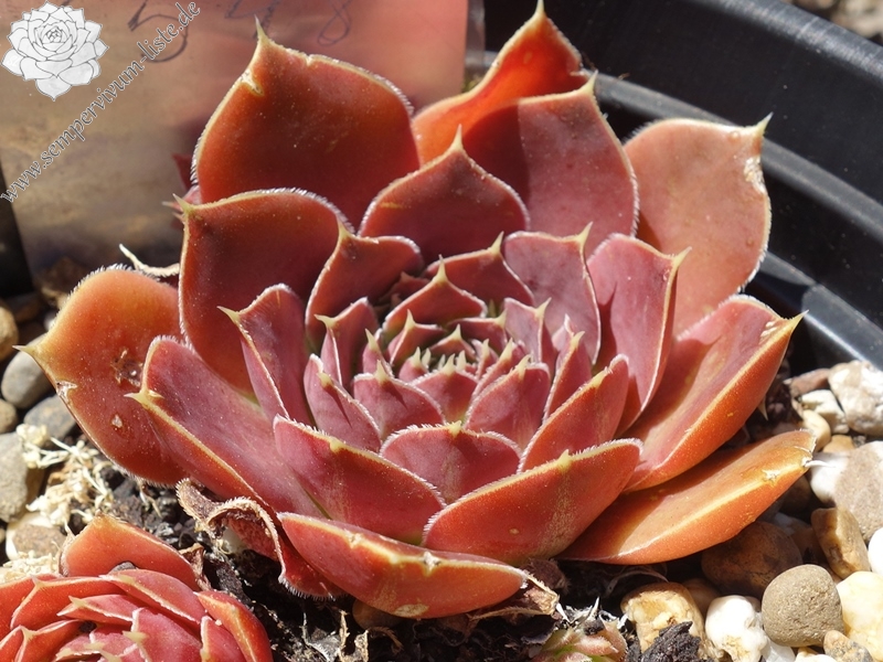 Rosetten bis 7 cm, Blätter breit spatelig, kurz bespitzt, pastellrotviolett - hellrosa, Blattränder hell, bewimpert