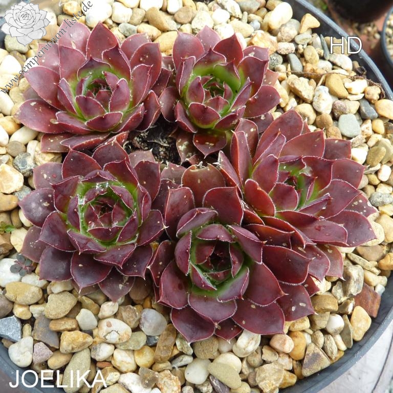 Rosetten bis 6 cm, Blätter oval, kurz bespitzt, Herz hellgrün, Rest purpurrot - weinrot