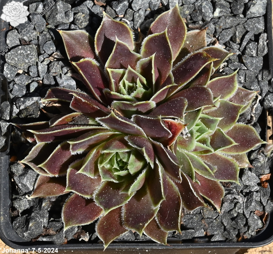 Rosette bis 13 cm, rotbraun-eisenoxid-lila, etwas bereift, Blätter eher schmal, Blattränder insbesondere in der heranwachsenden Phase grün kontrastierend, danach weiß, Blätter unten grün, hält die Farbe, robuste Pflanze, Absaat von Sempervivum heuffelii 'Plaisir de Manuel'.