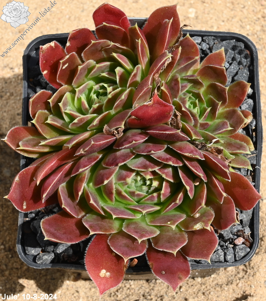 Rosetten bis 8 cm, Blätter linealisch, lang bespitzt, Basis helles grün, Rest marmoriertes rot - braun, Blattränder hell grün, leicht bewimpert, Aussaat 2001, Zufallssämling, benannt nach Jule Rüping