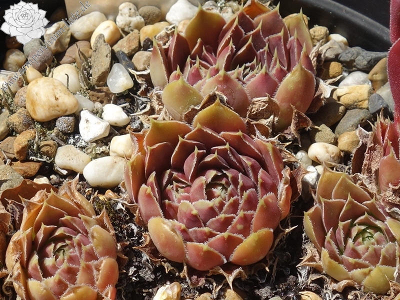 kleine Rosetten, Blätter eiförmig, kurz bespitzt, beigerot - rosa, Blattränder hell, bewimpert