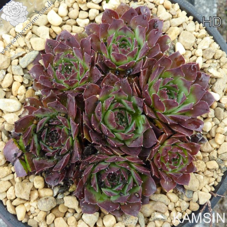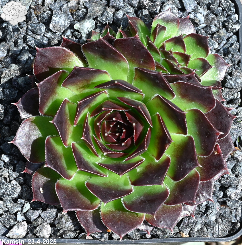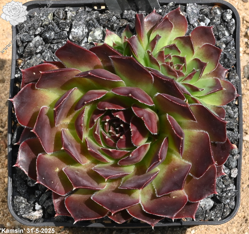 Eine neue Hybride aus Deutschland mit ca. 5 cm großen Rosetten. Die Spitzen sind breit himbeerrot gezeichnet.