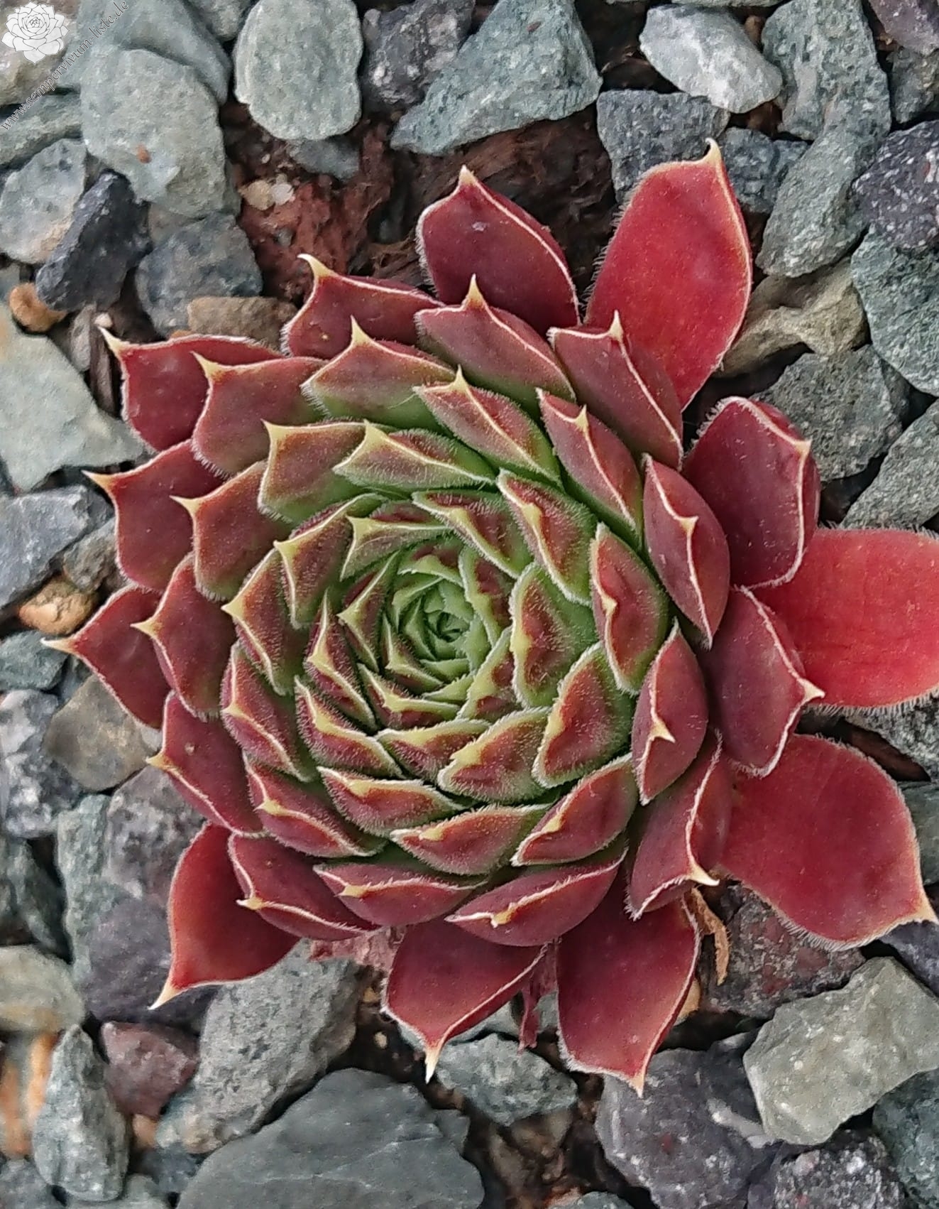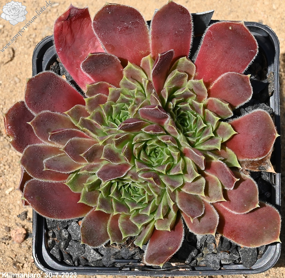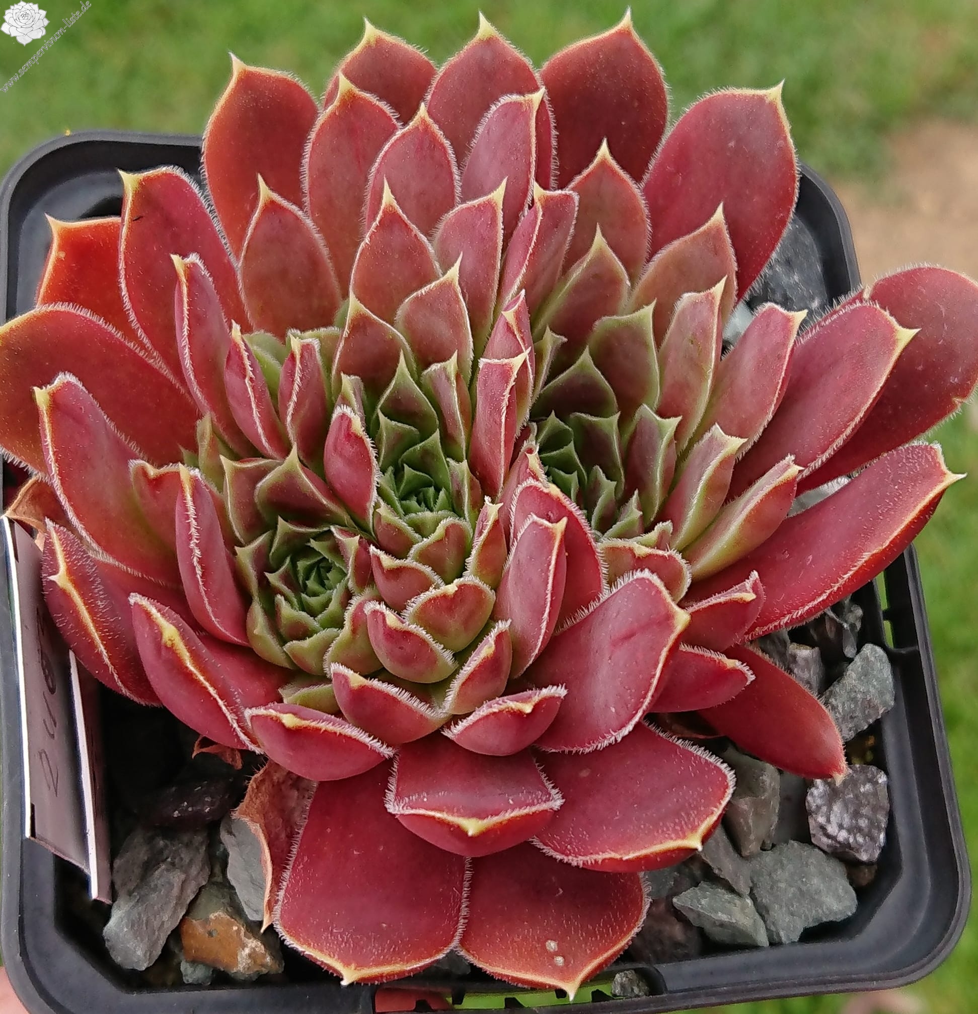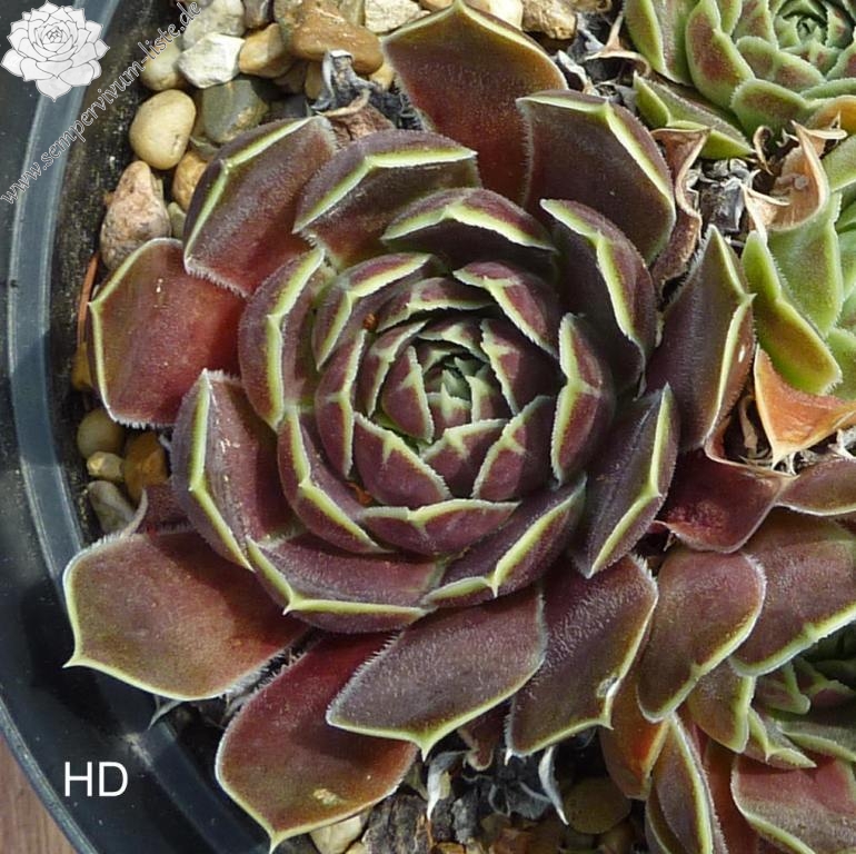 Rosetten bis 5 cm, keilförmige Blätter, kurz bespitzt, dunkles Weinrot, Blattränder grün