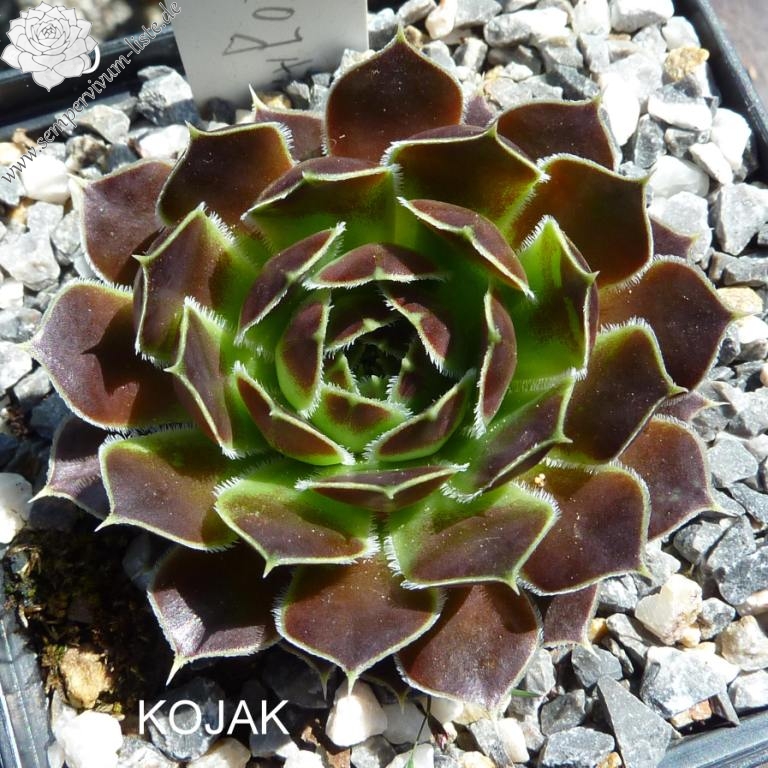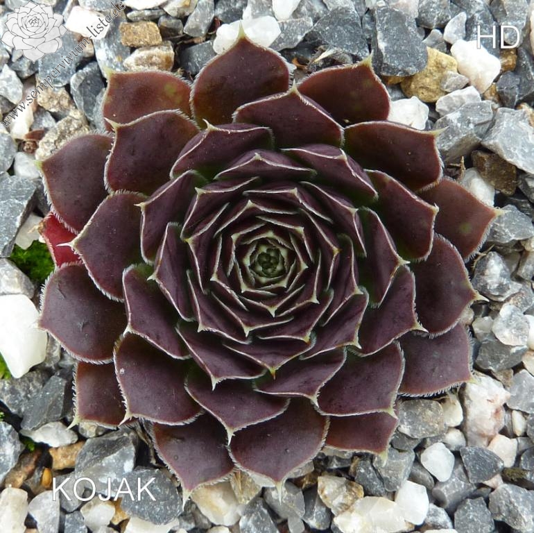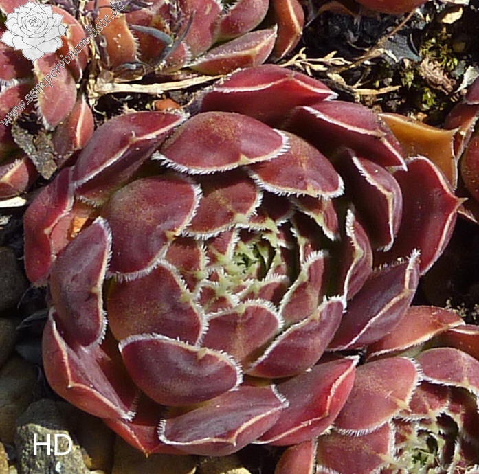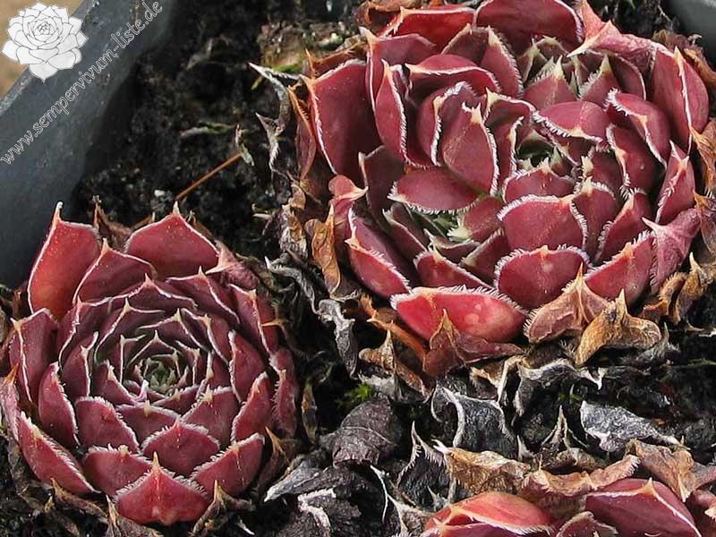kleine kompakte Rosetten, Blätter eiförmig, kurz bespitzt, dunkles Weinrot, Blattränder silbern bewimpert