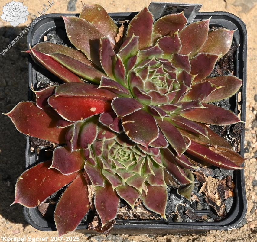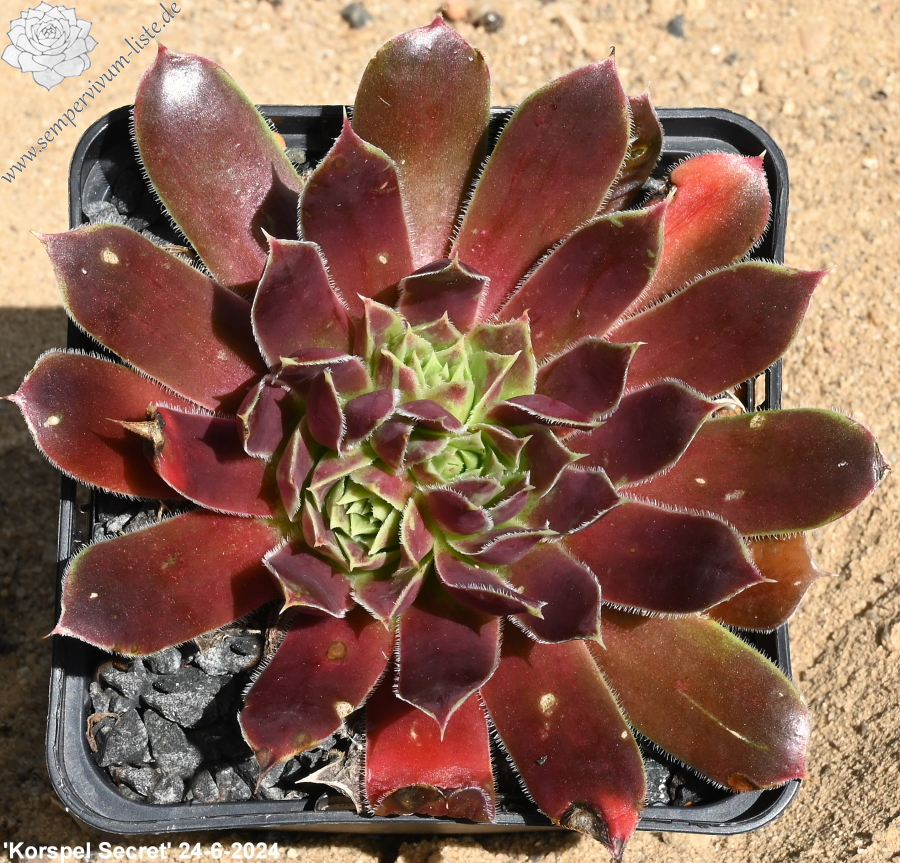 Rosetten bis 7 cm, Blätter breit spatelig, kurz bespitzt, weinrot - braunrot, Blattränder bewimpert