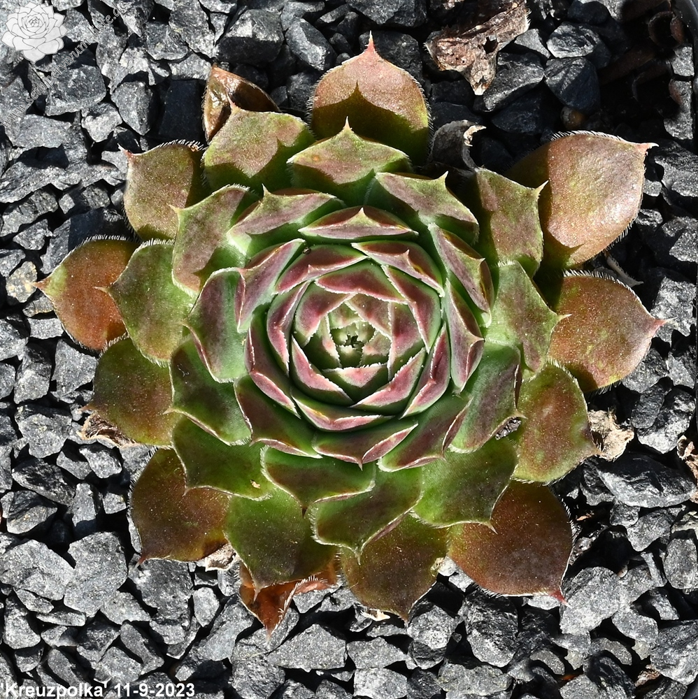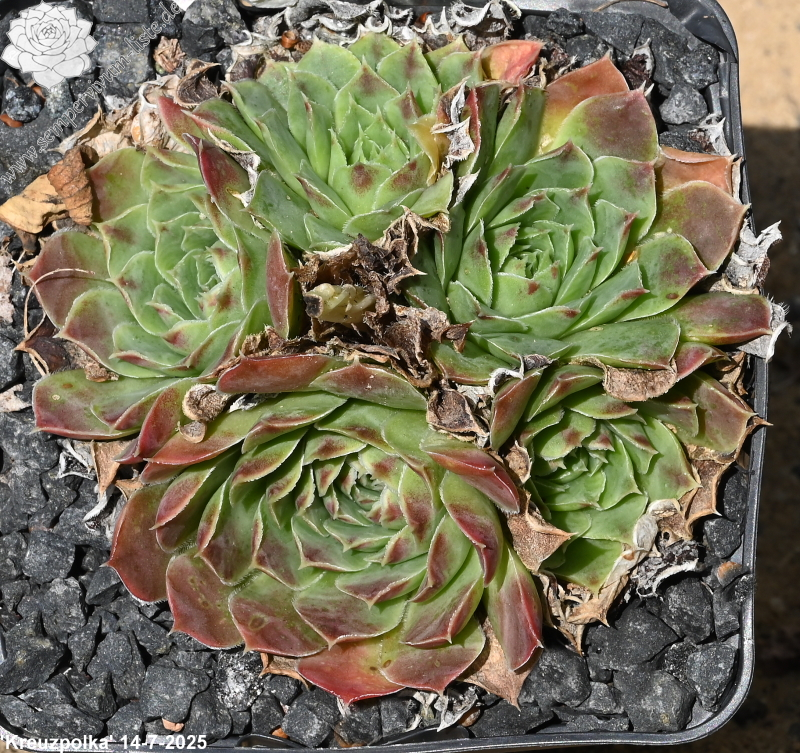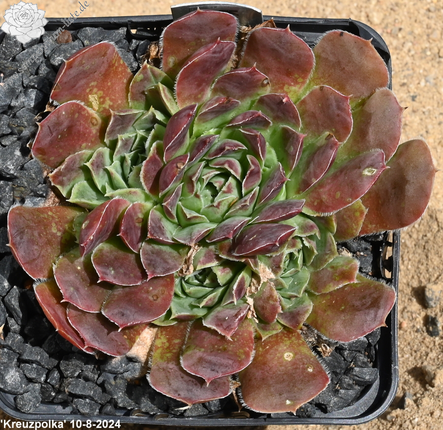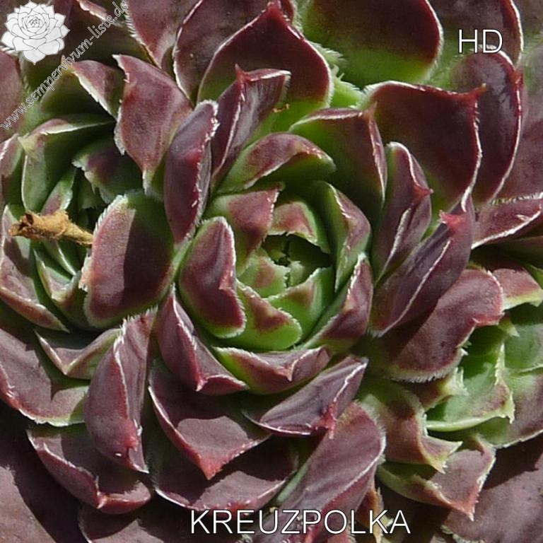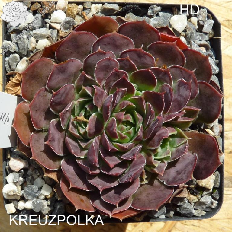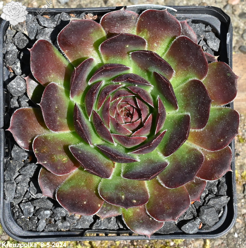 Rosetten bis 8 cm, quirlig, Blätter rundlich, kurz bespitzt, Herz hellgrün , Rest signalviolett - rotlila