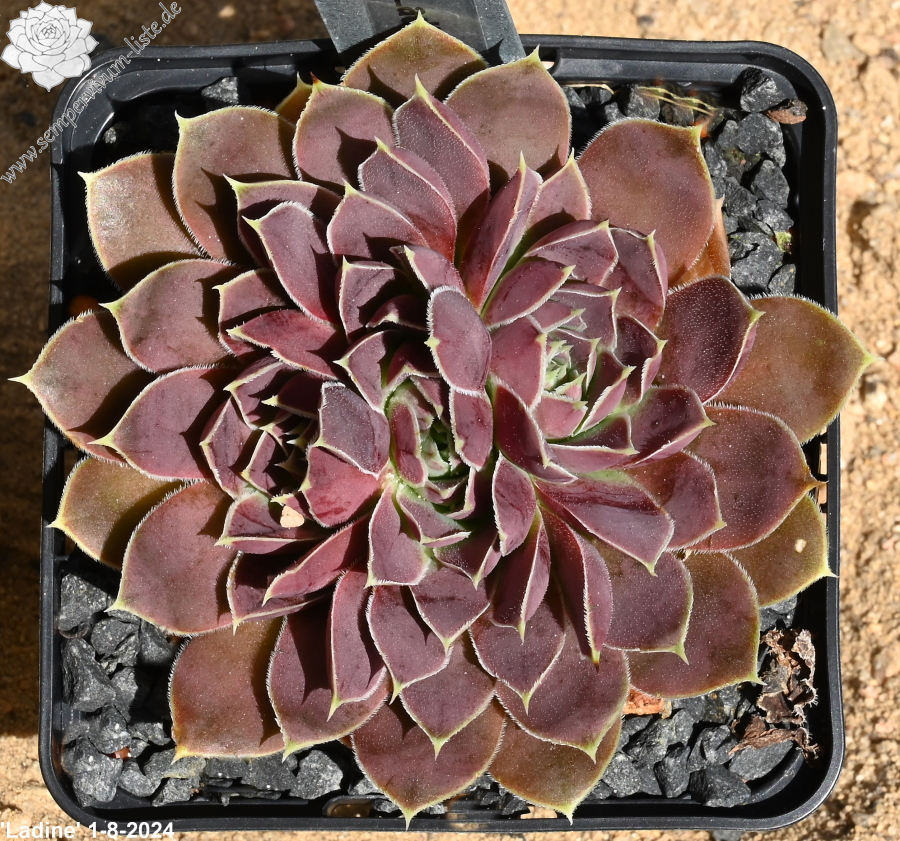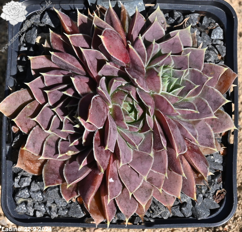 kleine Rosetten, Blätter oval, lang bespitzt, purpurrot - weinrot, Blattränder grünlich, bewimpert