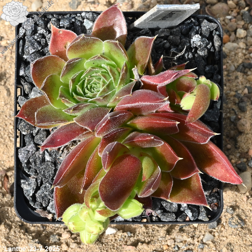 kleine Rosetten, Blätter keilförmig, kurz bespitzt, samtige Substanz, Herz hellgrün, Spitzen braun - rot, Ränder bewimpert