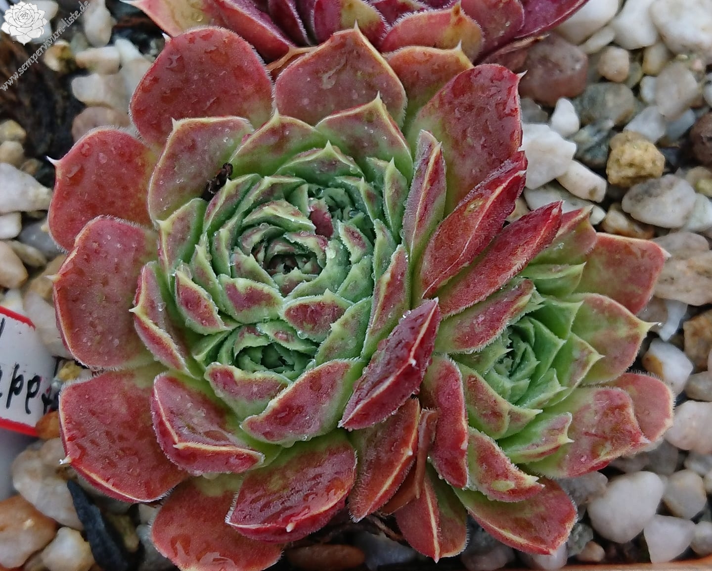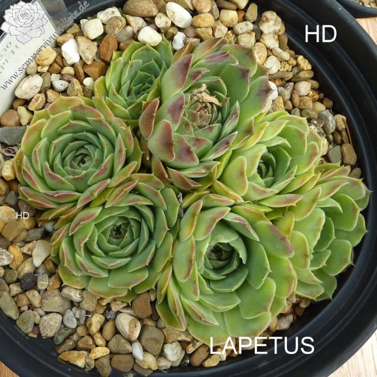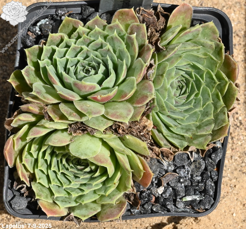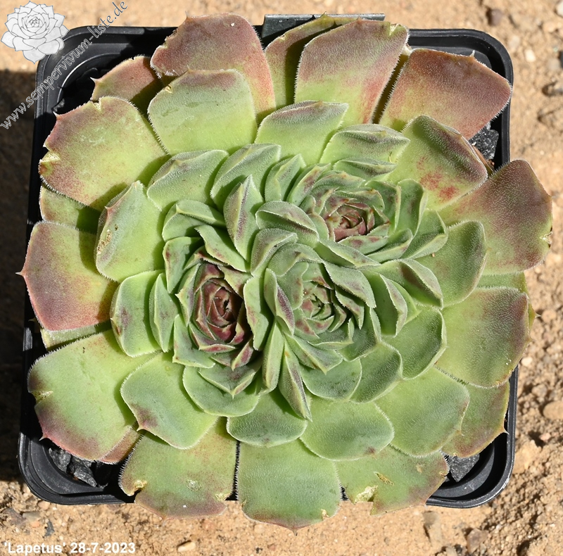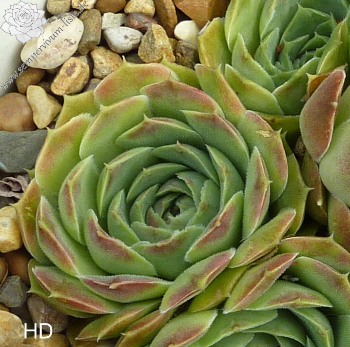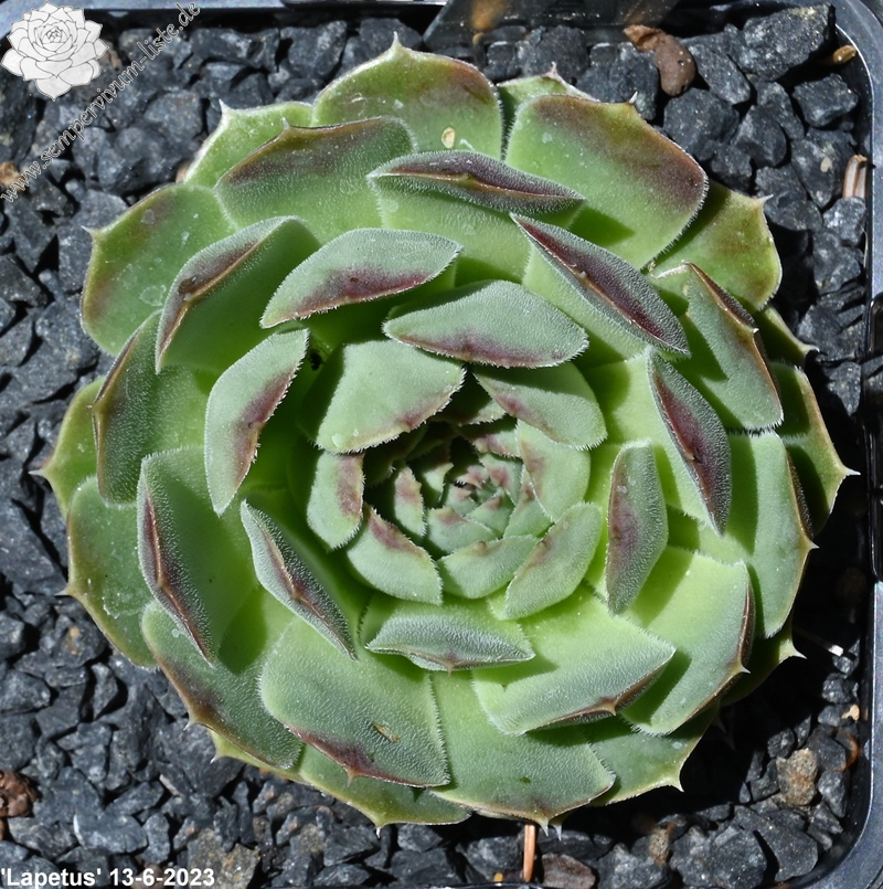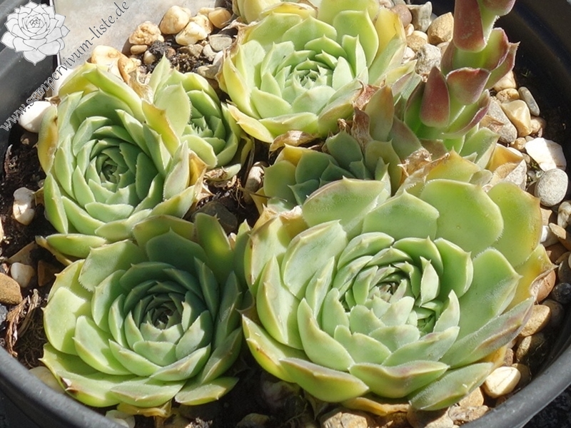 Rosetten bis 7 cm, keilförmige Blätter, kurz bespitzt, lindgrün, Spitzen leicht bräunlich - rosa überhaucht