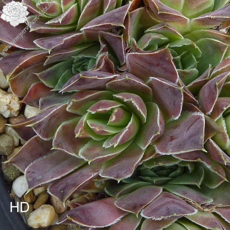 Rosetten bis 6 cm, Blätter lanzettlich, lang bespitzt, Basis olivgrün, Rest trübes Lila , Blattränder hell