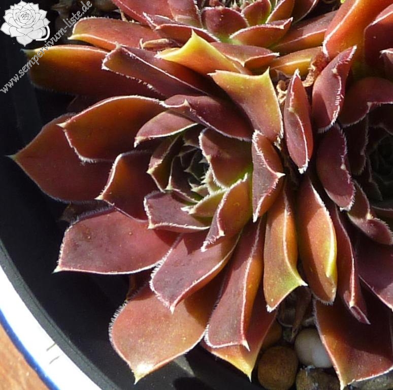 Rosetten bis 8 cm, Blätter oval, lang bespitzt, Mischtöne rot - rosa - braun, Blattränder hell bewimpert