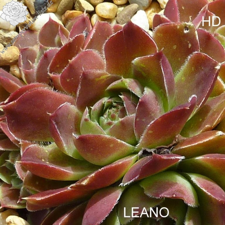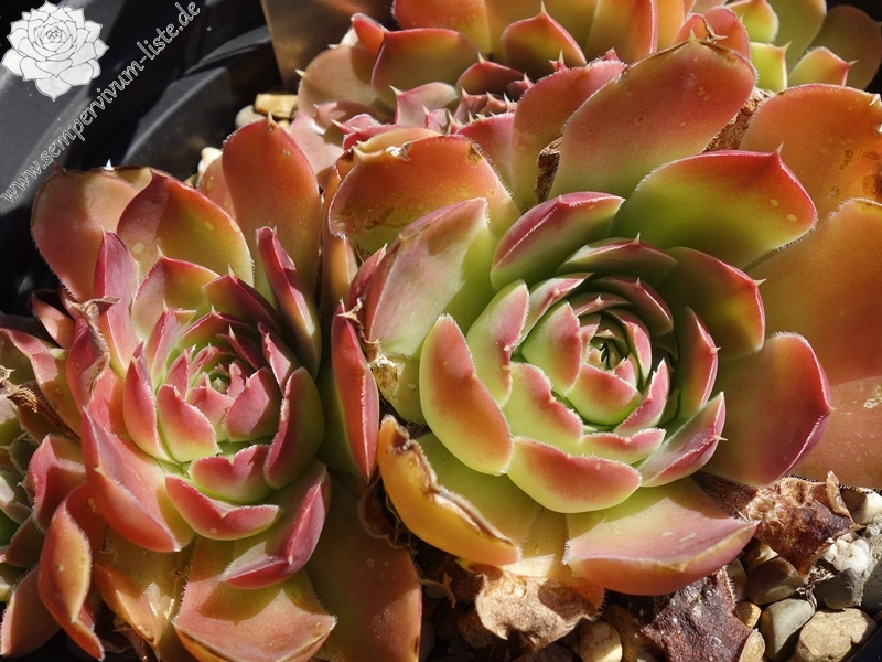 Rosetten bis 6 cm, Blätter oval, kurz bespitzt, karminrot - lachsrot, Basis hellgrün
