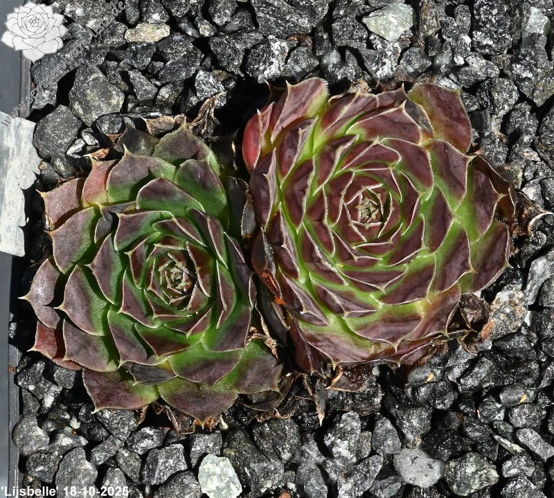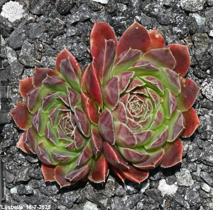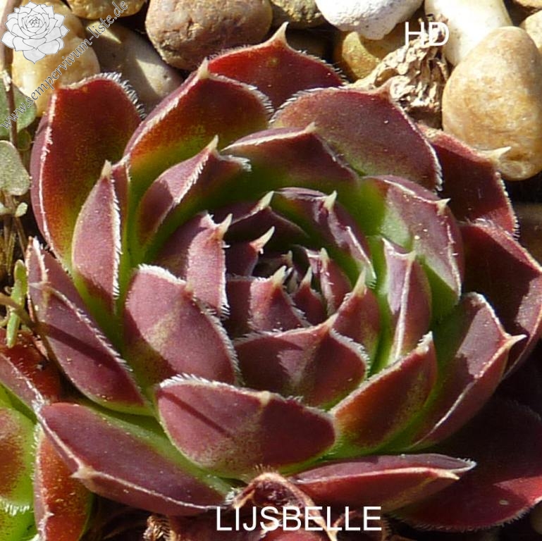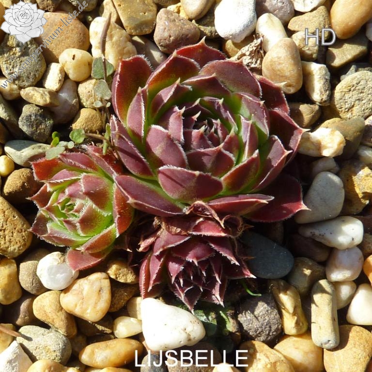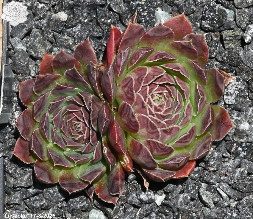 kleine Rosetten, Blätter rundlich, kurz bespitzt, weinrot, Basis hellgrün, Blattränder bewimpert