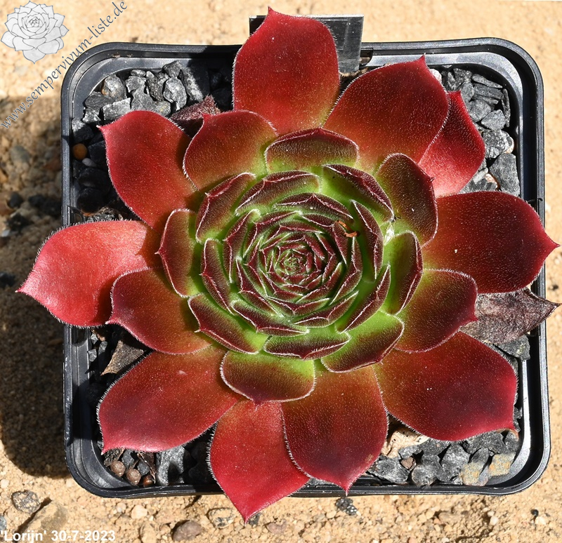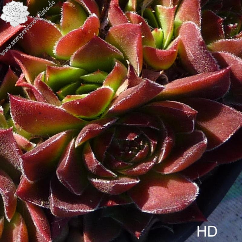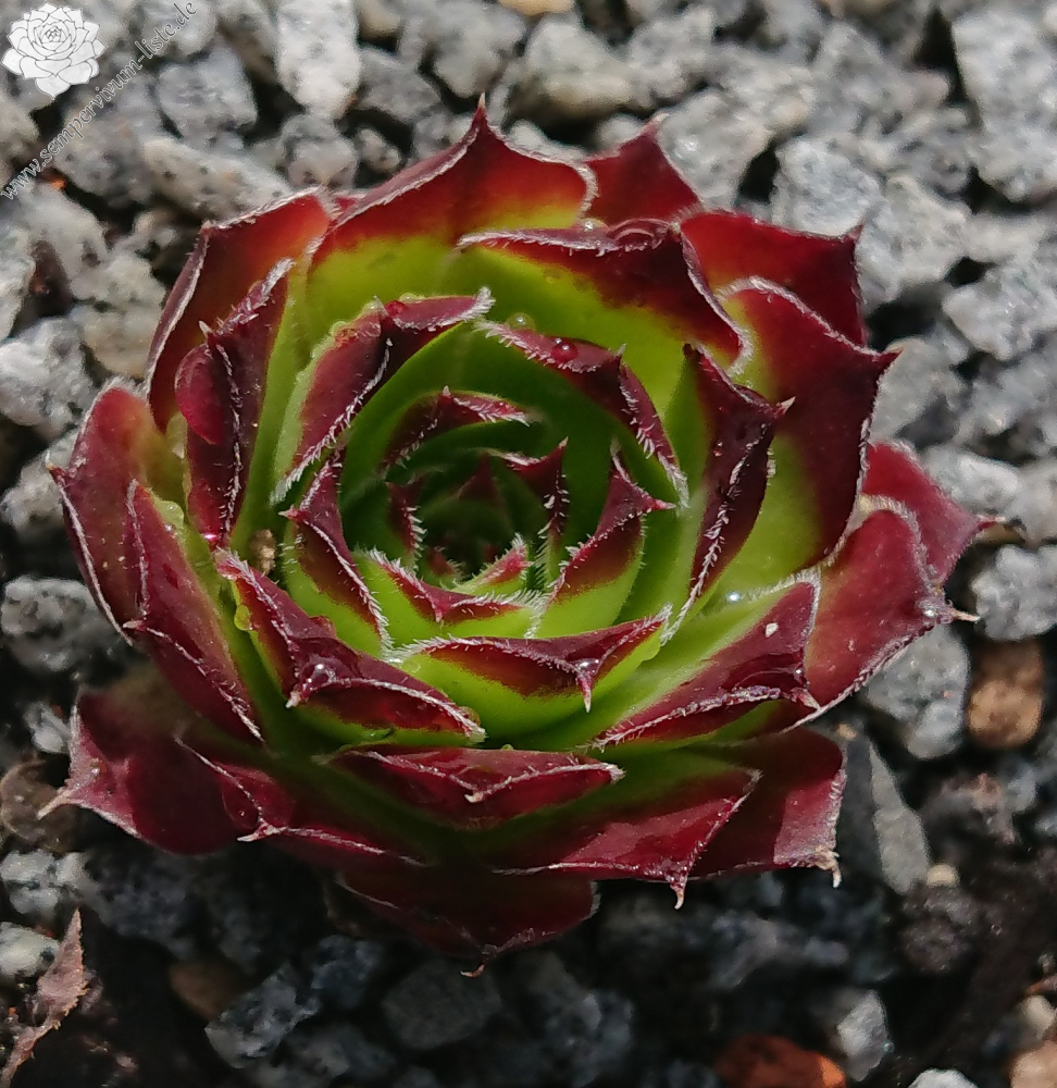 kleine Rosetten, Blätter linealisch, lang bespitzt, leuchtendes Dunkelrot, Blattränder hell bewimpert