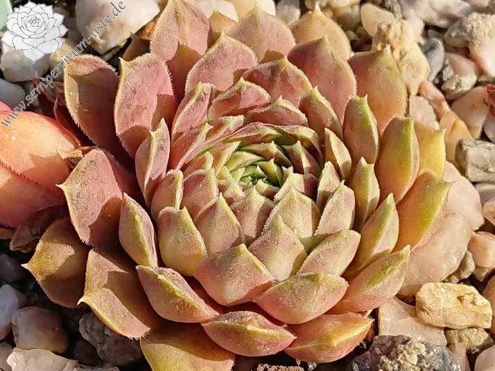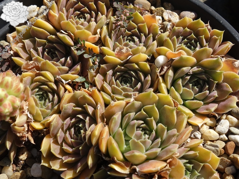 Rosetten bis 5 cm, Blätter linealisch, lang bespitzt, Mischfarben pastellgelb - hellrosa - altrosa