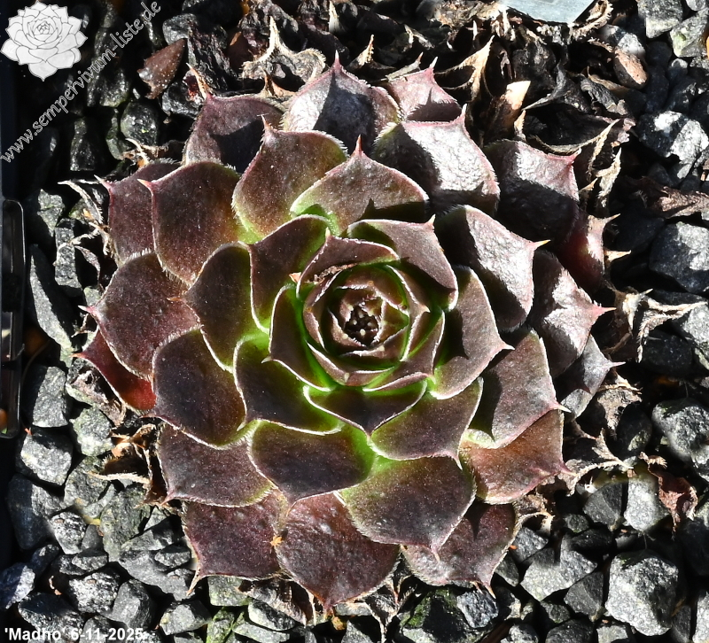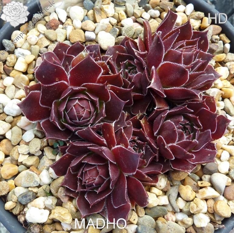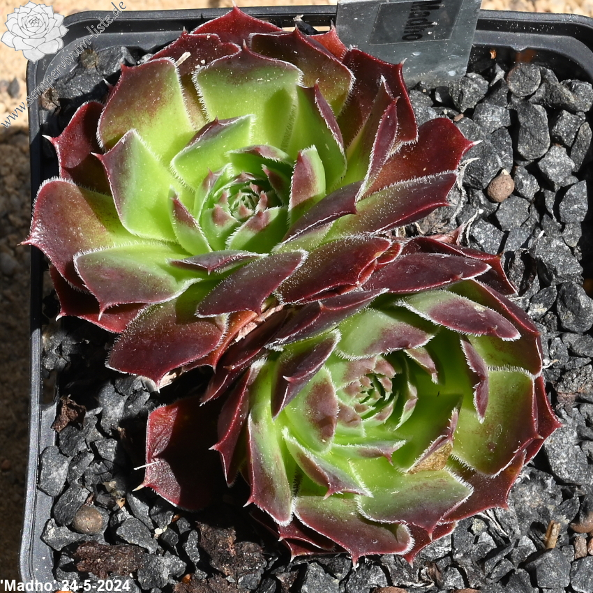Rosetten bis 5 cm, Blätter breit spatelig, kurz bespitzt, purpurrot - weinrot, Blattränder bewimpert
