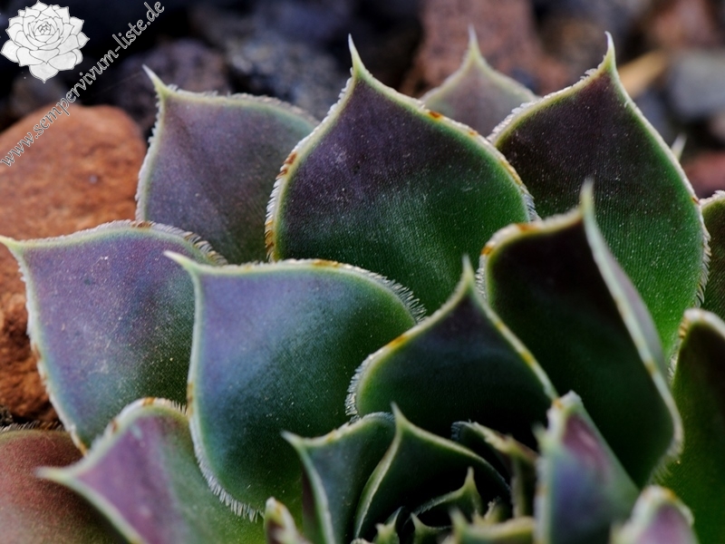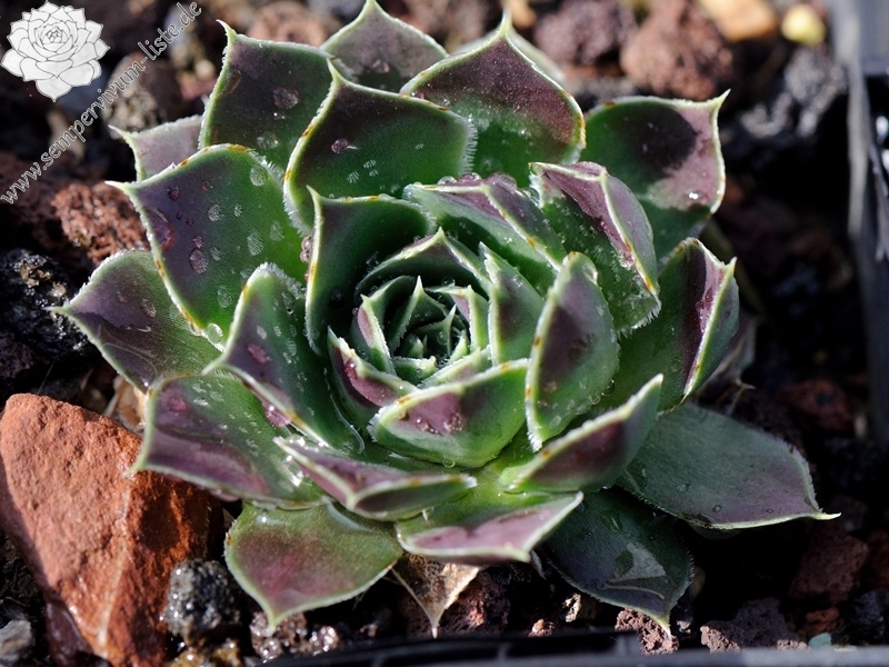 Rosette 8 cm, Blätter breit, oben in der Hauptfärbungszeit bis zum breitesten Bereich ins Dunkelviolette mit Glanz gehend, unten grün, weiß gerandet, ausgeprägt gespitzt, vergrünt zum Sommer hin, robuste Pflanze.