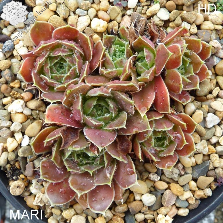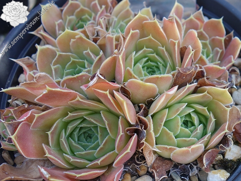 kleine Rosetten, Blätter linealisch, kurz bespitzt, lachsorange, Basis lindgrün, Blattränder gelblich, bewimpert