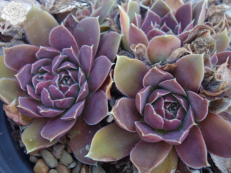 Rosetten bis 5 cm, Blätter oval, kurz bespitzt, Mischfarben hellrosa - pastellrotlila, Blattränder hell