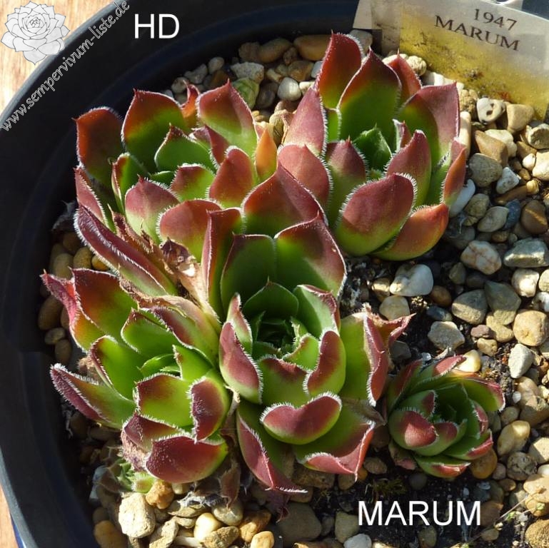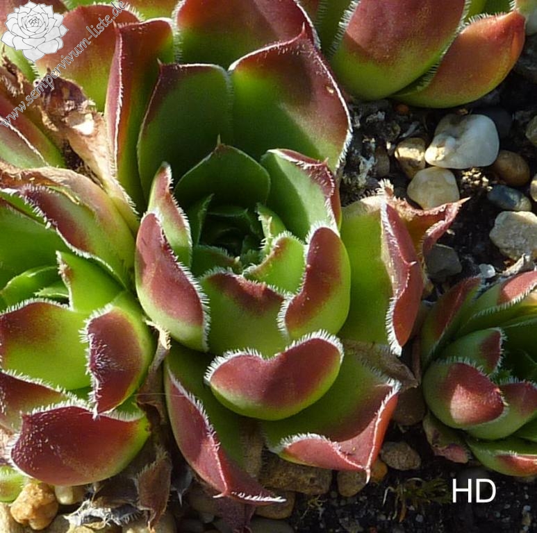 Rosetten bis 6 cm, ovale Blätter, lang bespitzt, Basis hellgrün, Spitzen dunkles Rot - Braun, Ränder bewimpert