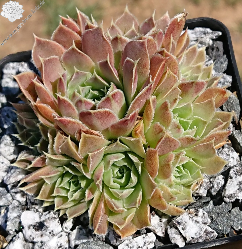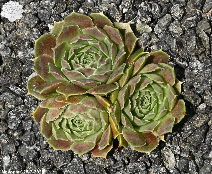 'Mayapán' bildet mittelgroße Rosetten von bis zu 6 cm Durchmesser, deren Blattränder leicht bewimpert sind. Das Herz zeigt sich im Frühjahr Mischfarben hellgrün- altrosa - beigebraun ineinander überlaufend, wobei die kleinen Blattdornen besonders zur Geltung kommen. Im Sommer zeigen sich die äußeren Blätter in einem fast gelb/orangefarbenen Ton, wobei sich ihr Herz dann komplett in helles Grün verwandelt und auch die Blattdornen diese Farbe annehmen. An den Blattunterseiten ist das ganze Jahr über ein Streifen sichtbar, der mal mehr oder weniger ausgeprägt ist, aber nie ganz verschwindet – im Gegensatz zu vielen Sorten, bei denen dieses Merkmal nur kurzzeitig zu sehen ist. Sie vermehrt sich gut und ist robust wie die meisten Heuffelii.