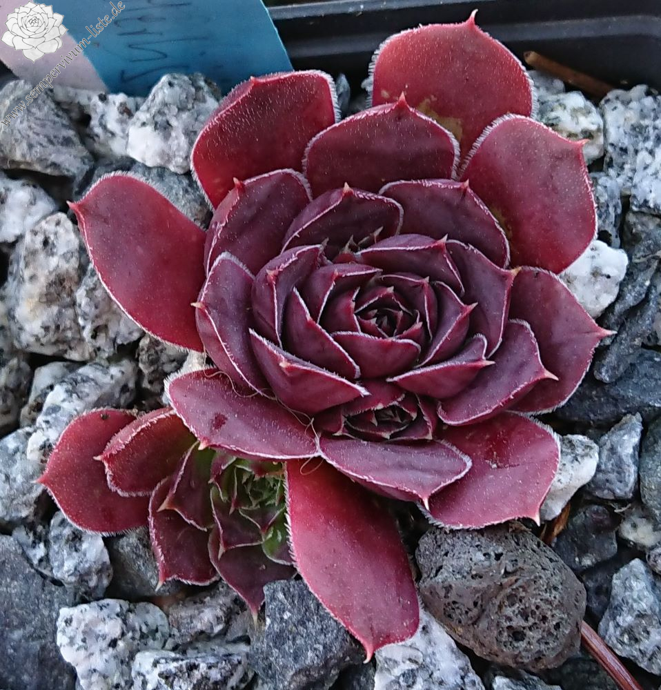 kleine Rosetten, Blätter breit keilförmig, kurz bespitzt, purpurrot - weinrot, Blattränder leicht bewimpert