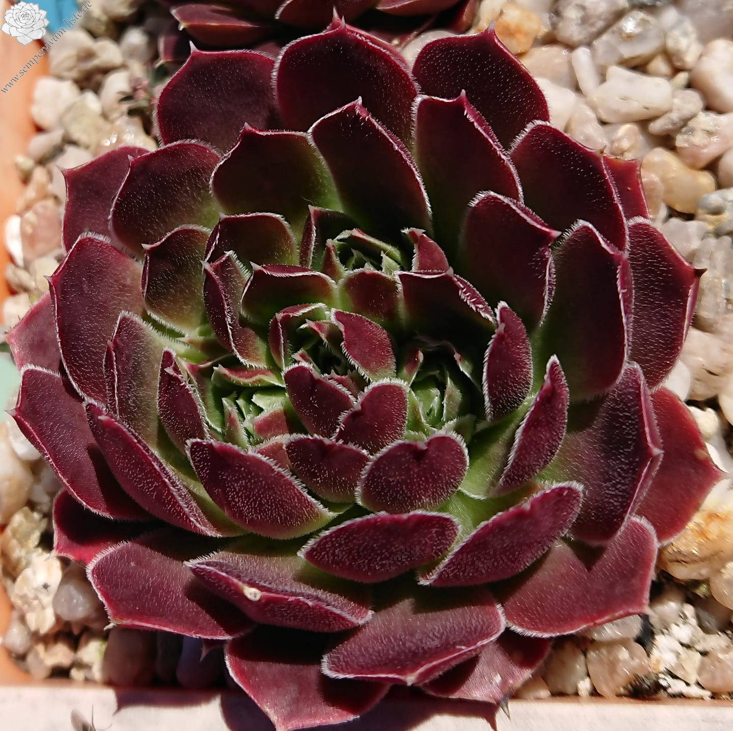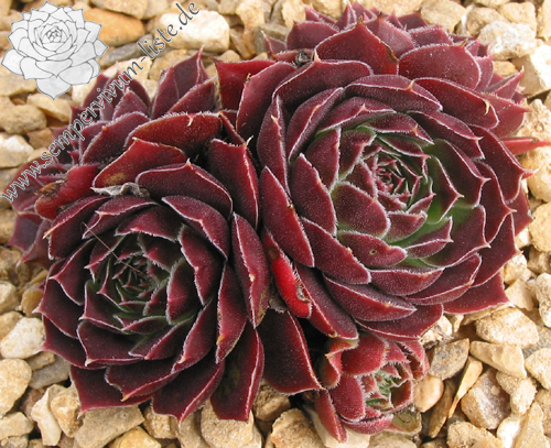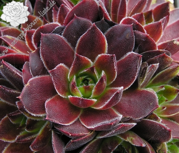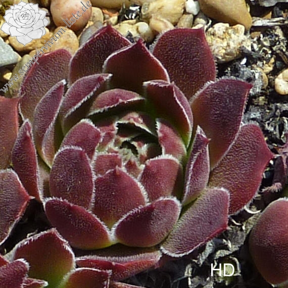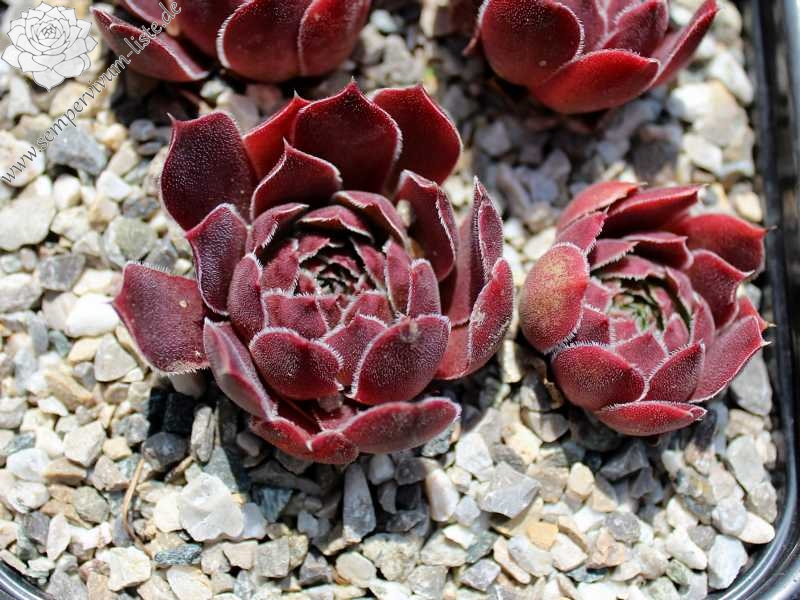 Rosetten bis 5 cm, Blätter keilförmig, kurz bespitzt, samtige Substanz, dunkles Lila - Rot, Blattränder silbern bewimpert