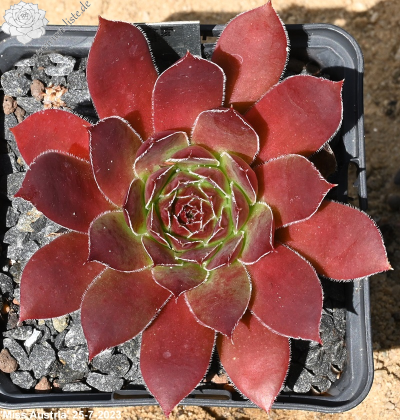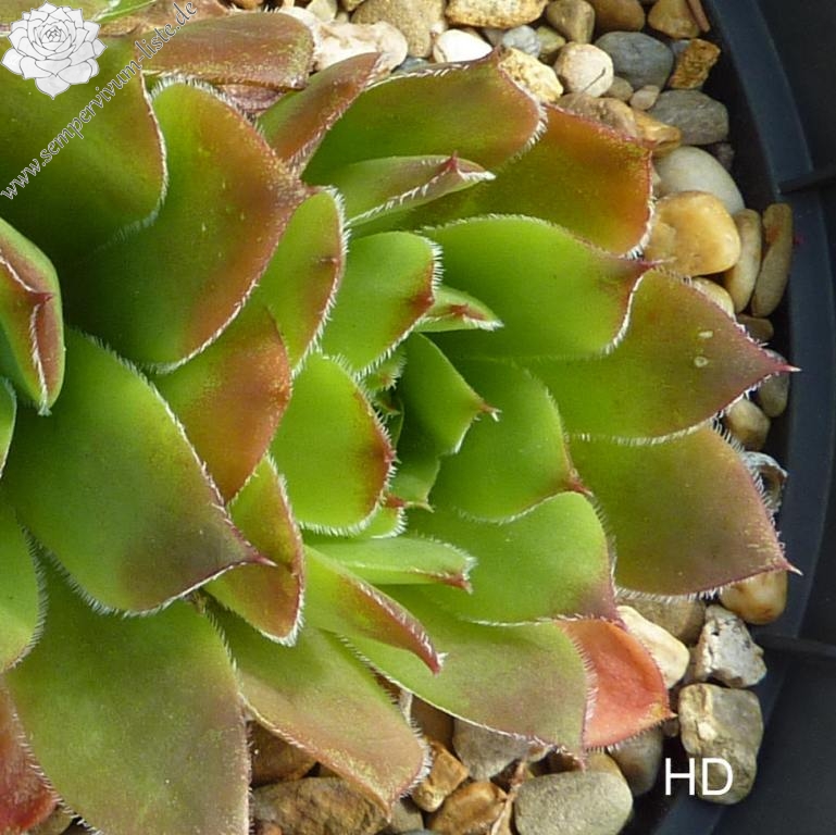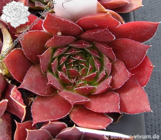 Eine deutsche Sorte mit rotbrauner Färbung. Bei nährstoffärmeren Substrat mit wenig Feuchtigkeit strahlen die Rosetten in leuchtendem Karminrot. Ähnlich der der Züchtung S. heuffelii 'Jovi King' aus den Niederlanden.