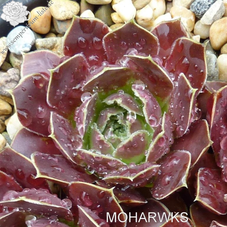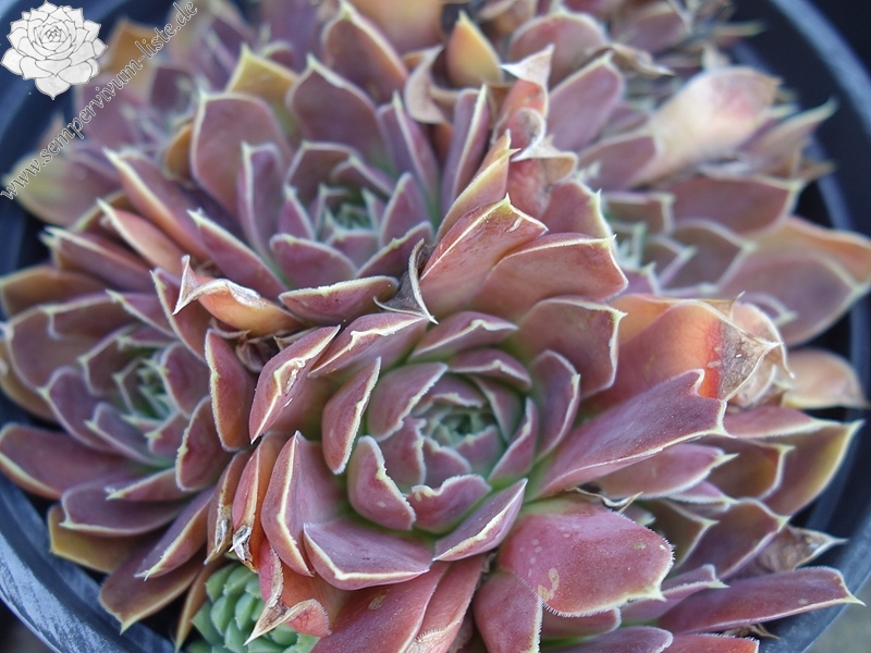 Rosetten bis 7 cm, Blätter breit keilförmig, kurz bespitzt, bordeauxrot - pastellviolett, Herz hellgrün, Blattränder hell, bewimpert