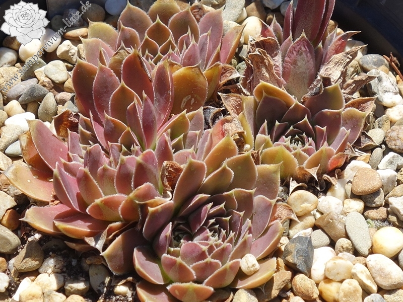Rosetten bis 5 cm, Blätter keilförmig, kurz bespitzt, Mischtöne trübes Oliv - Lila , Blattränder hell