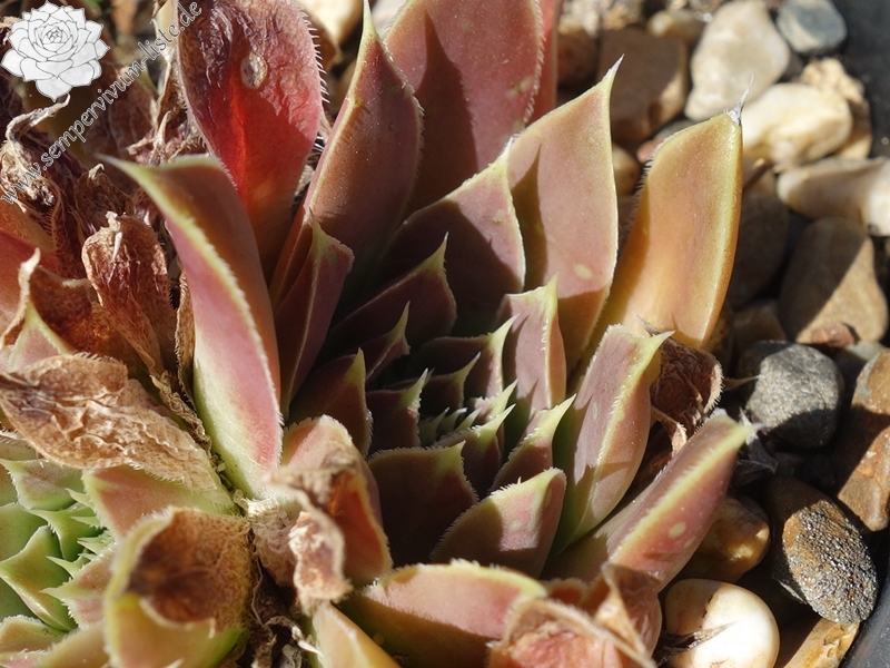 kleine Rosetten Blätter oval, lang bespitzt, pastellbraunrot - beigerot, Blattränder gelblich, bewimpert