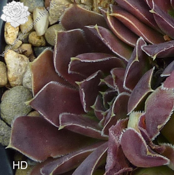 Rosetten bis 5 cm, Blätter lanzettlich, lang bespitzt, lila, Blattränder hell bewimpert
