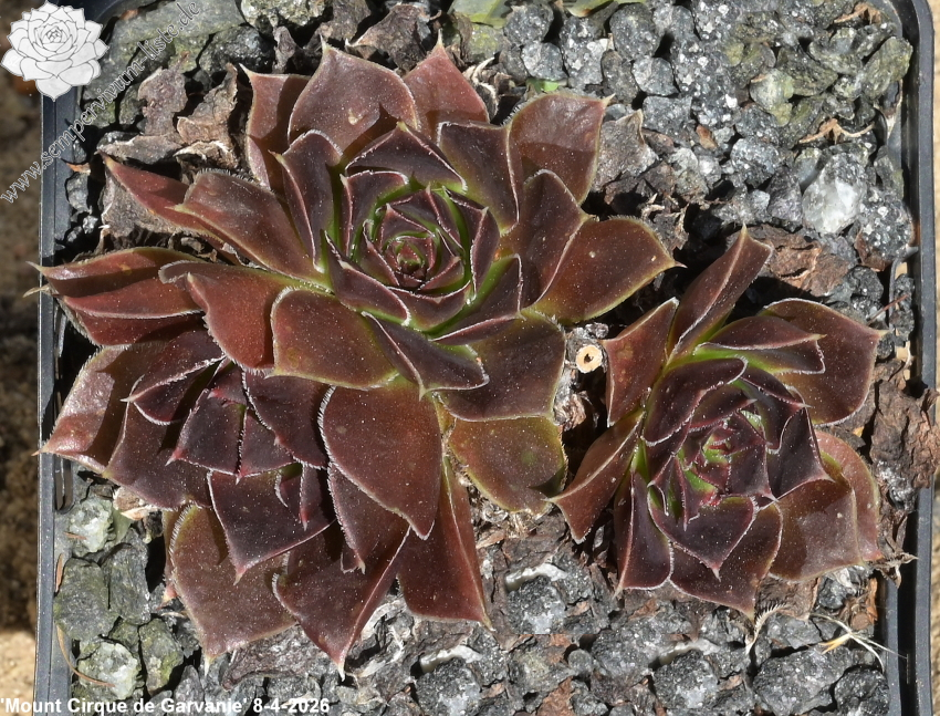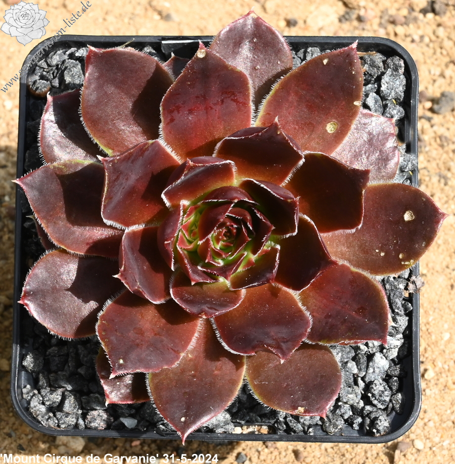 Rosetten bis 7 cm, Blätter Oval, lang bespitzt, rubinrot - karminrot, Blattränder bewimpert