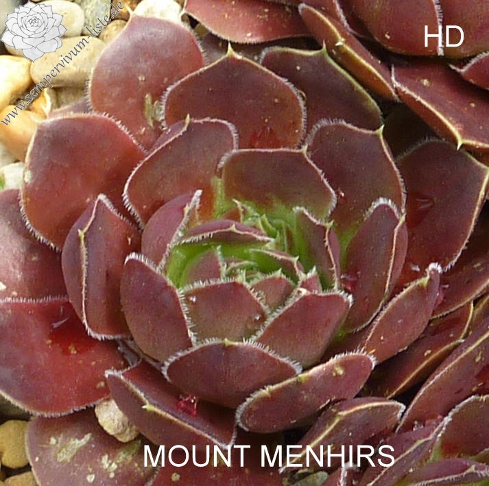 Rosetten bis 8 cm, Blätter breit spatelig, kurz bespitzt, weinrot, Basis hellgrün, Blattränder bewimpert