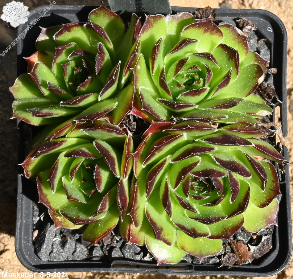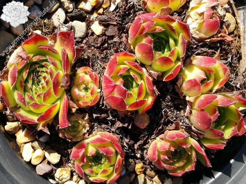 Rosetten bis 5 cm, Blätter linealisch, kurz bespitzt, hellgrün mit rotbraunen Spitzen