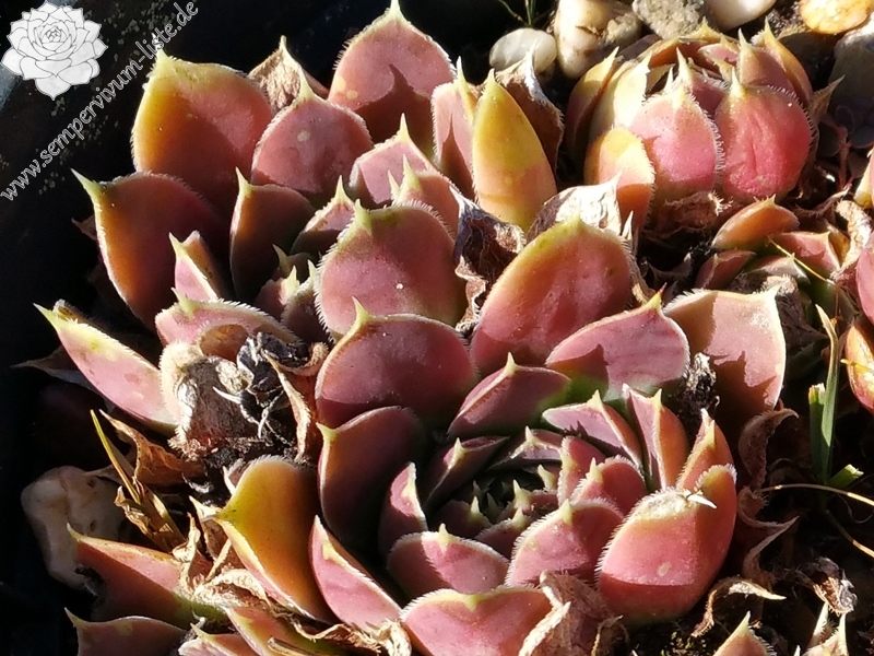 kleine Rosetten, Blätter eiförmig, lang bespitzt, Mischtöne orange - rosa, Blattränder gelb