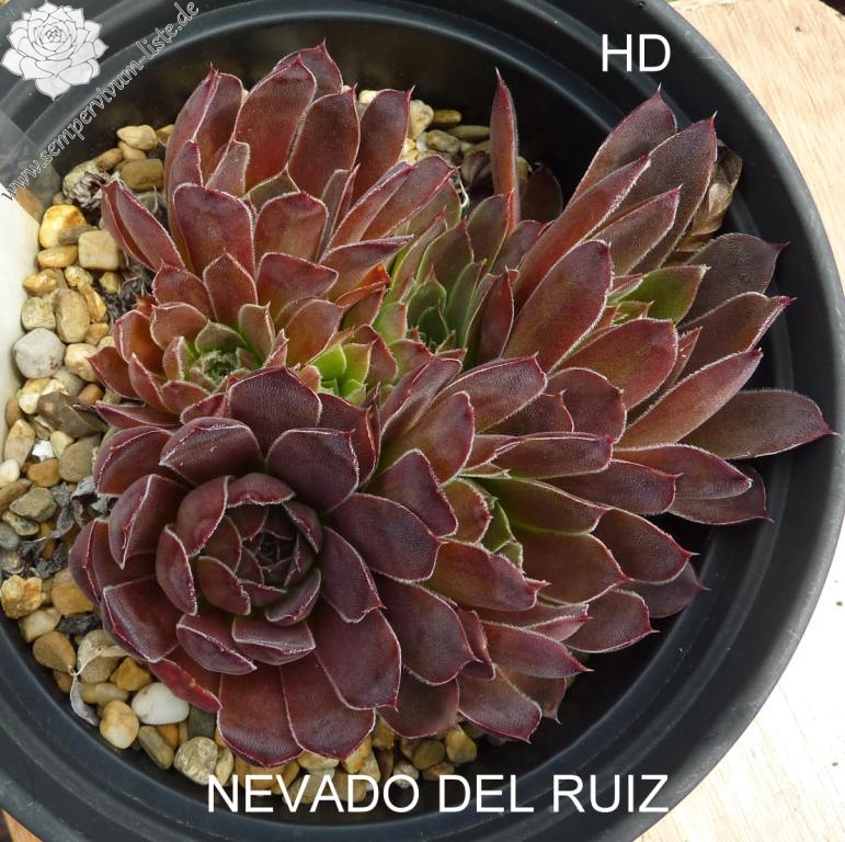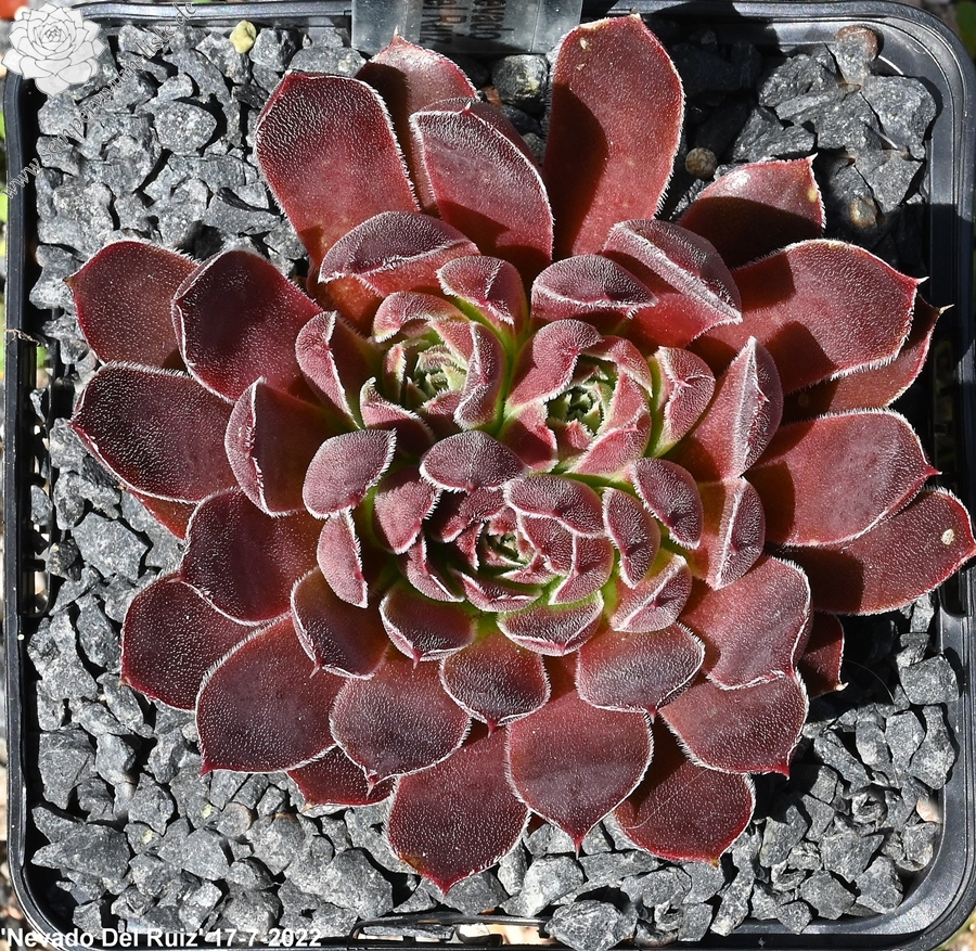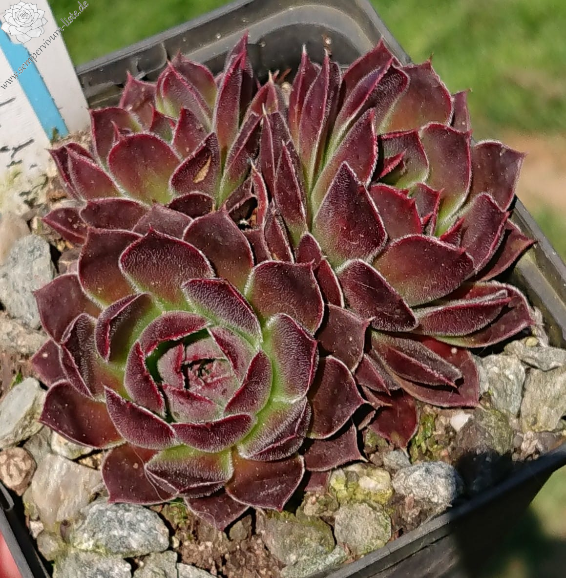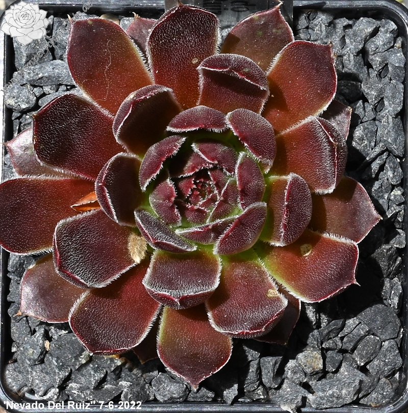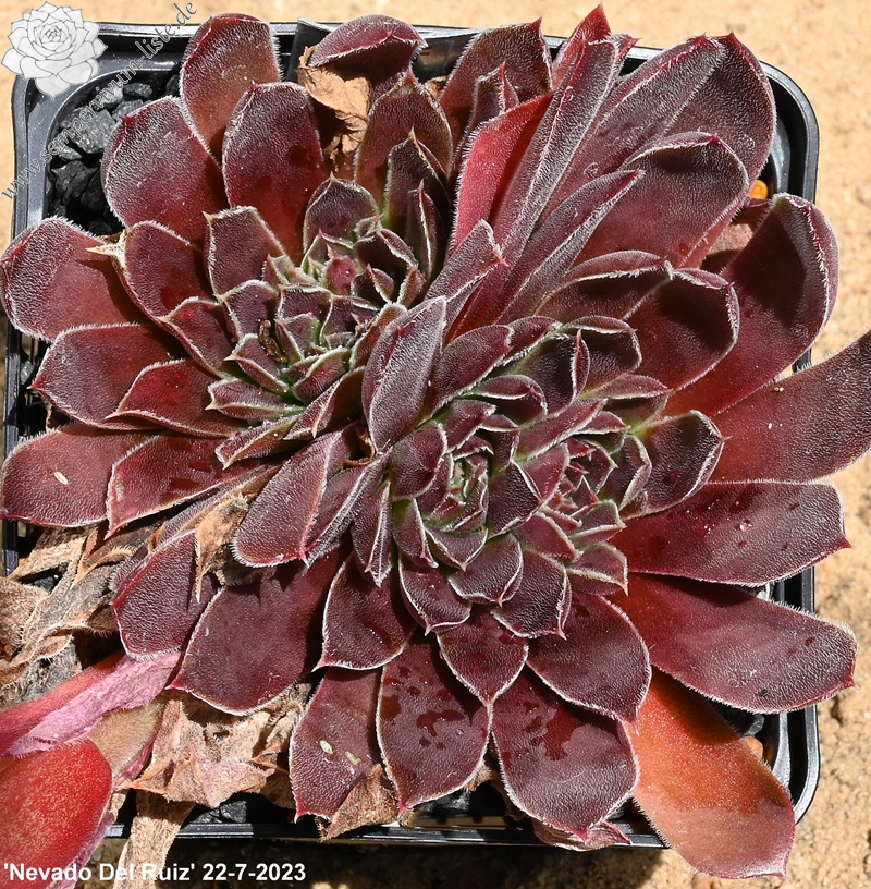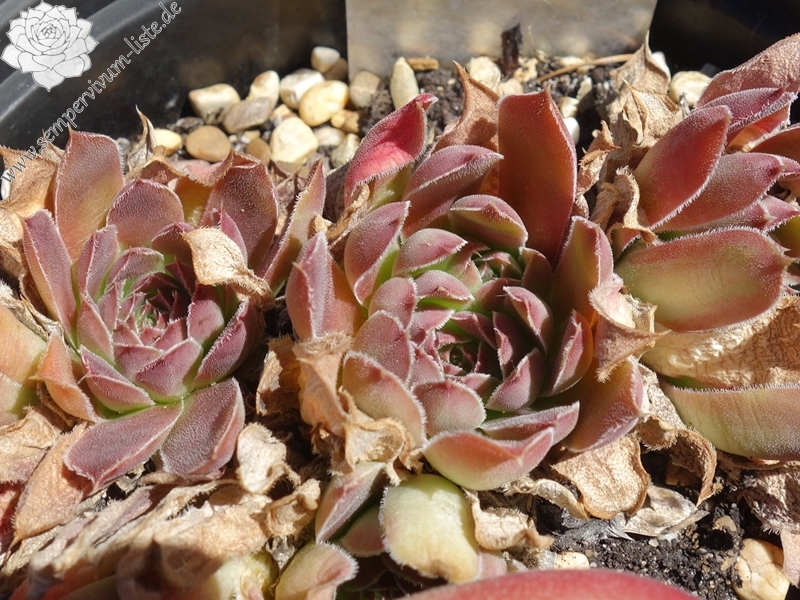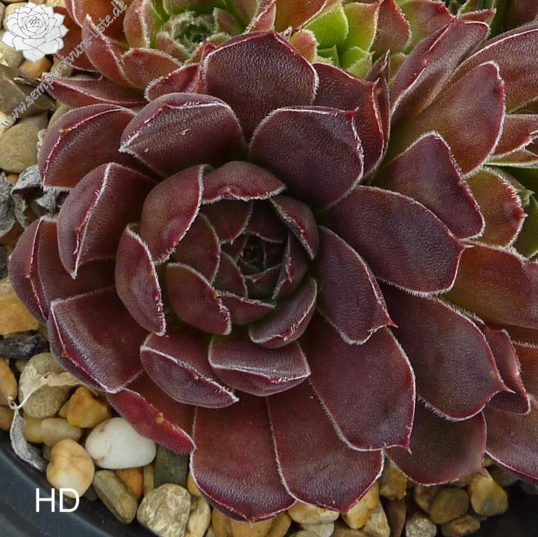sehr große Rosetten, Blätter linealisch, lang bespitzt, samtige Substanz, sehr dunkles Rotbraun, Ränder silbrig bewimpert
