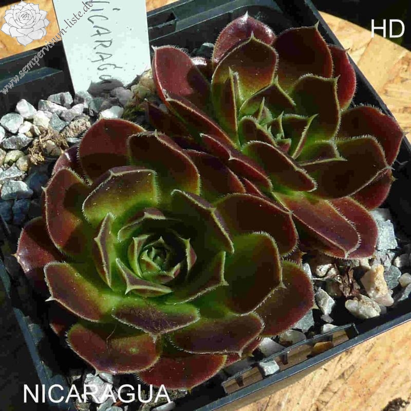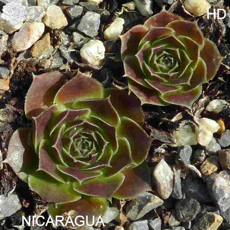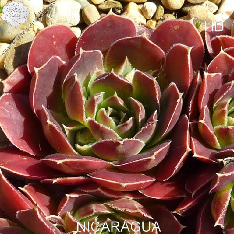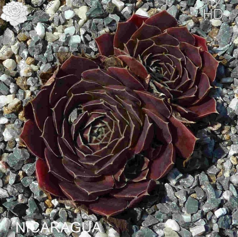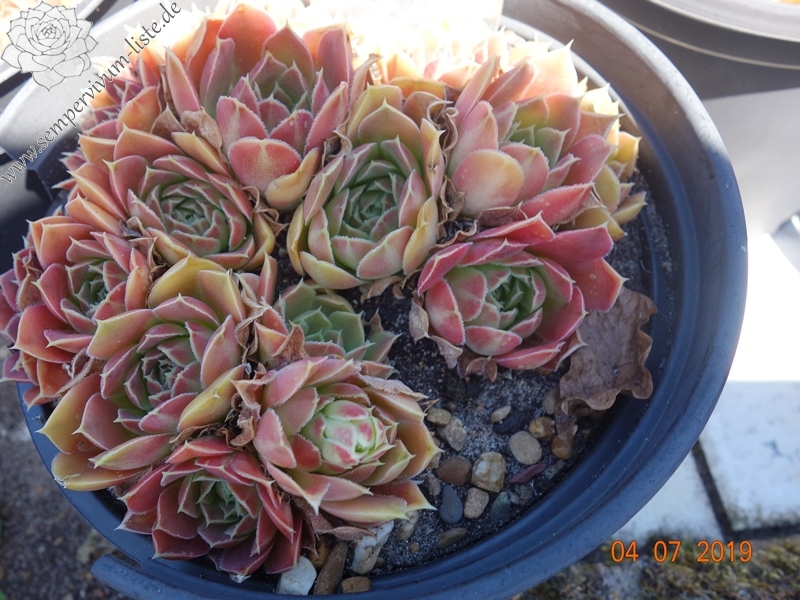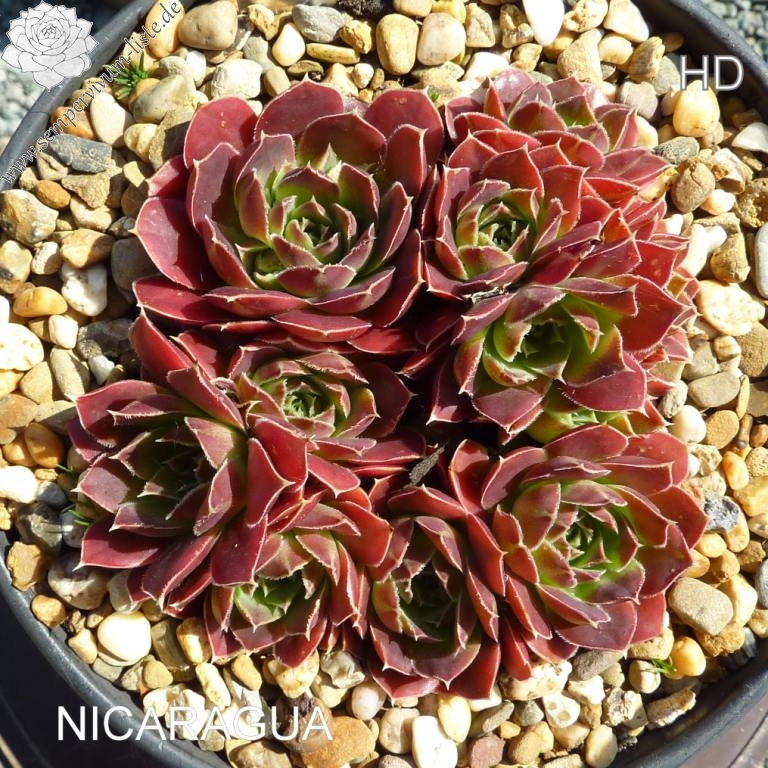 Rosetten bis 7 cm, Blätter rundlich, kurz bespitzt, leuchtend Erdbeerrot, Herz gelbgrün