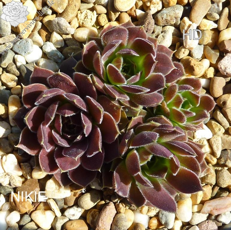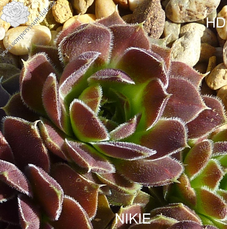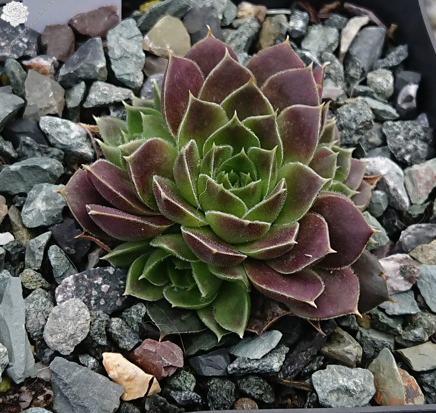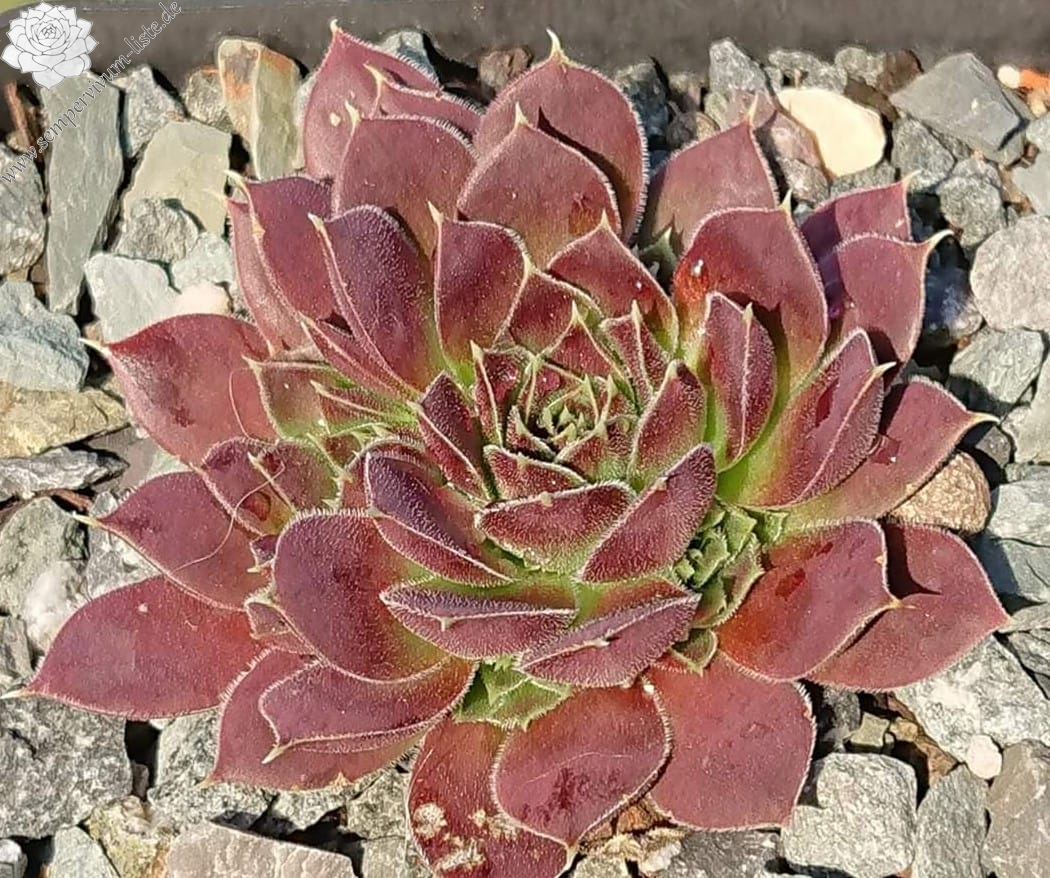 kleine Rosetten, Blätter oval, lang bespitzt, samtige Substanz, erikaviolett - braunrot, Herz hellgrün, Blattränder bewimpert