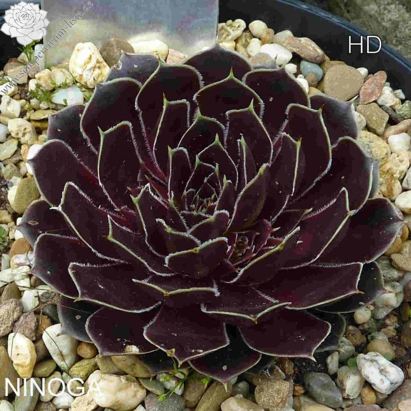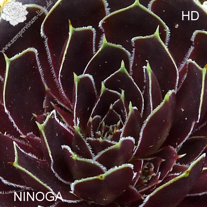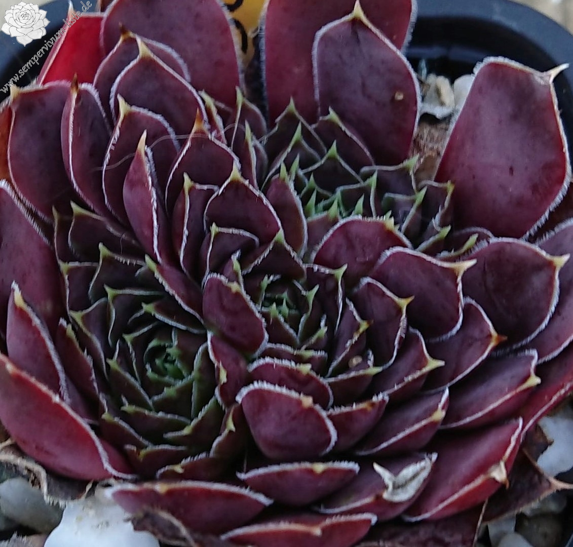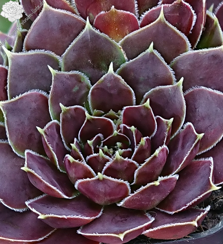 Rosetten bis 10 cm, Blätter breit spatelig, kurz bespitzt, purpurviolett, Blattränder grünlich, leicht bewimpert