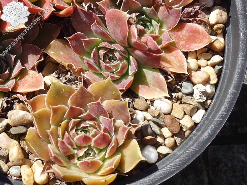 flache Rosetten bis 10 cm, Blätter linealisch, am oberen Ende rundlich, kurz bespitzt, Mischfarben lindgrün - pastellrosa - lachsrot