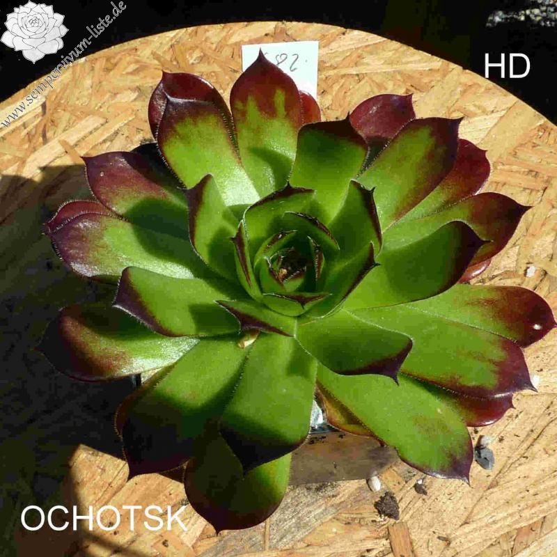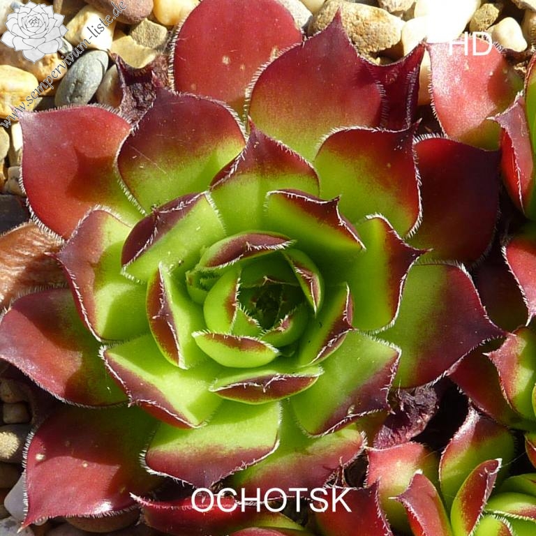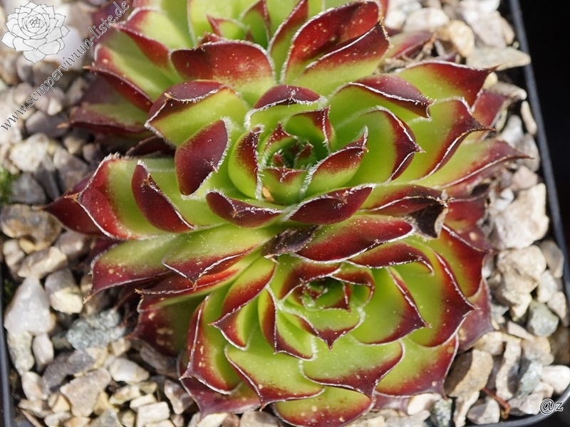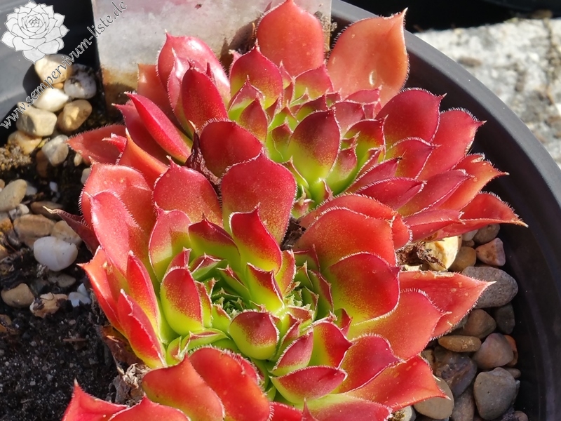 Rosetten bis 8 cm, Blätter breit spatelig, lang gespitzt, hellgrün, Spitzen blutorange, Blattränder bewimpert